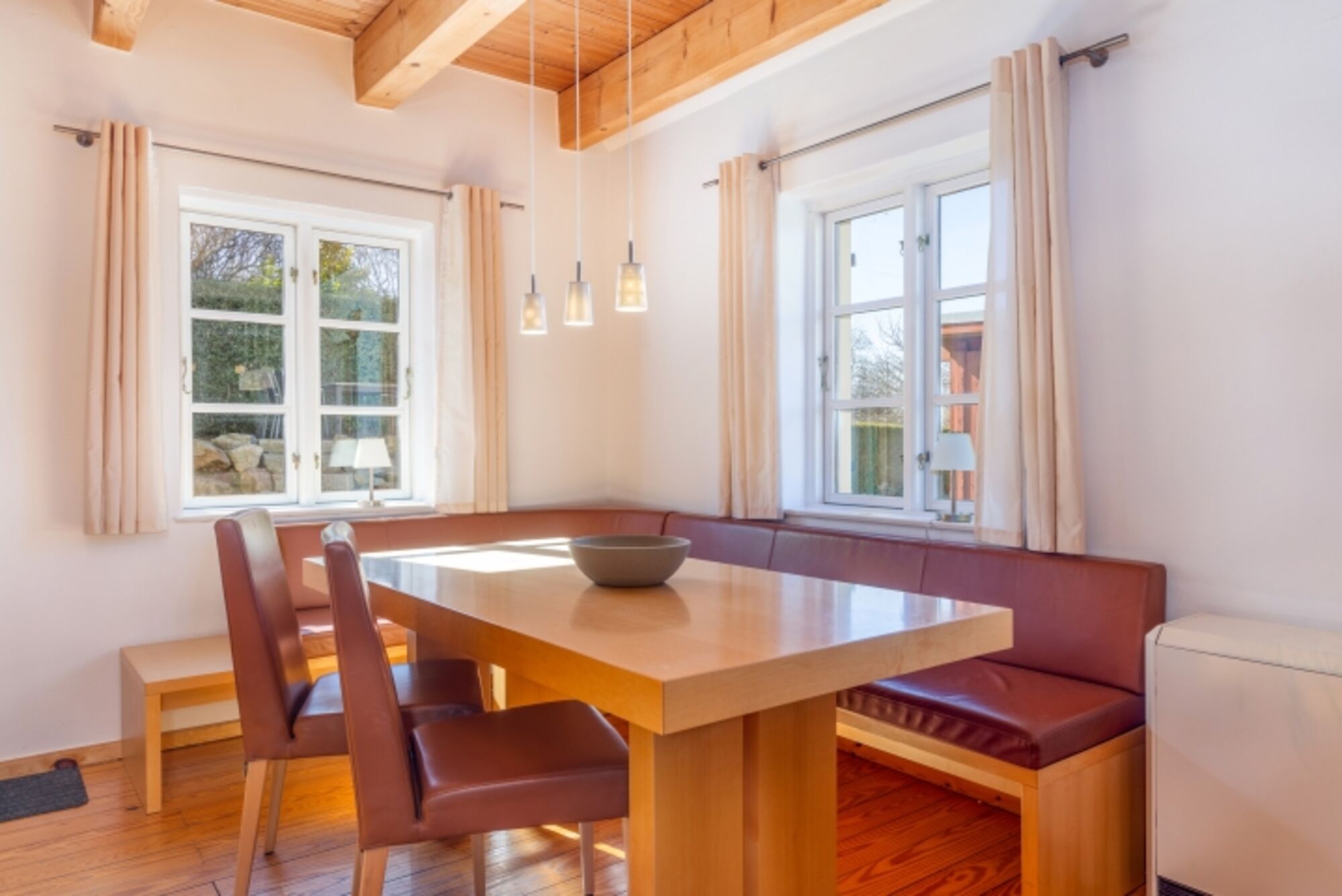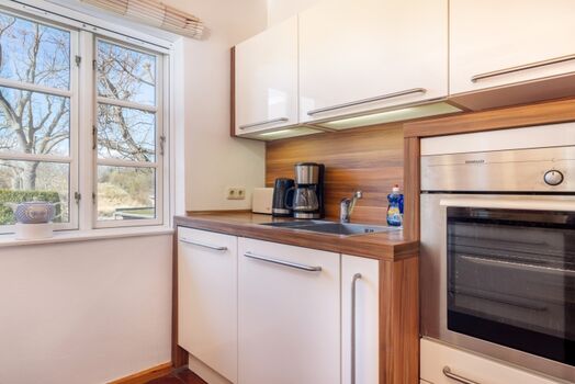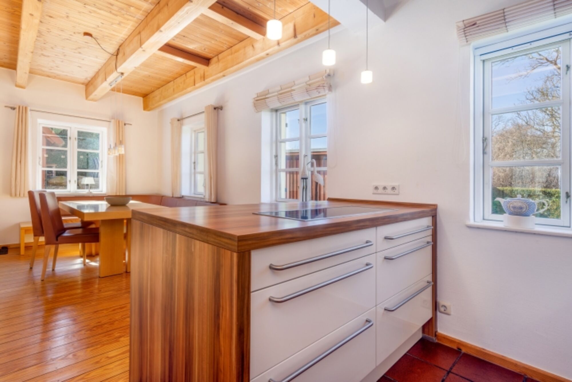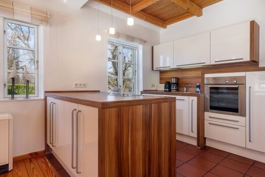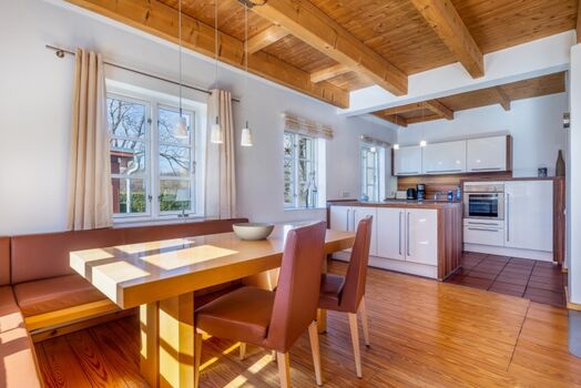 Die offene Küche lässt das Herz aller Hobbyköche höher schlagen. Sie sieht nicht nur chic aus, sondern ist mit Ceranherd, Mikrowelle, Backofen, Kühlschrank mit Gefrierfach, Geschirrspüler, Kaffeemaschine, Wasserkocher und Toaster sowie allem nötigen Besteck und Geschirr allerbestens ausgestattet. Speisen können Sie wahlweise am großen Esstisch im Wohnzimmer oder bei passendem Wetter auch auf der überdachten Frühstücksterrasse, wo Sie die Morgensonne zu Gast haben.