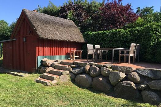 Auf dem gepflegten Gartengrundstück gibt es ein kostenfrei nutzbares Saunahäuschen und eine weitere, etwas erhöht liegende Terrasse. Von hier aus genießen Sie einen wunderbaren Blick in die umgebende Landschaft und bis hinüber zum Jagdschloss Granitz.