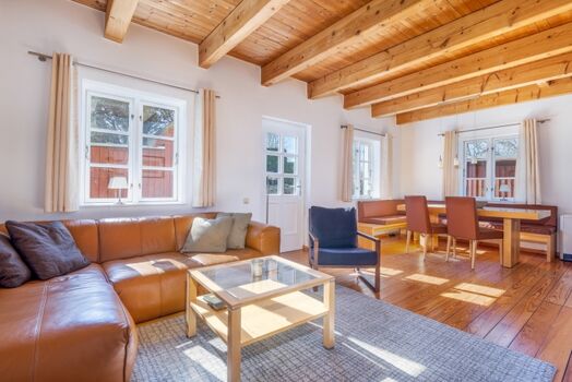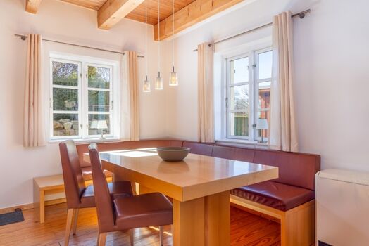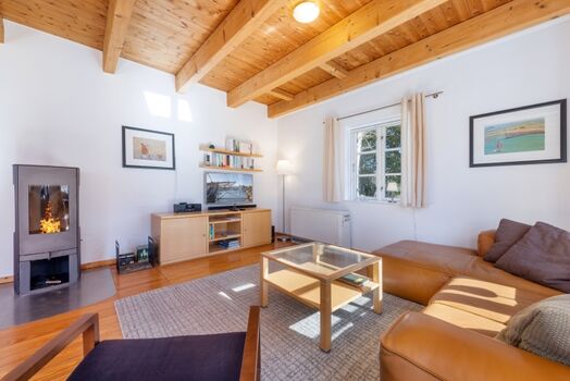 Im Erdgeschoss mit seiner urgemütlichen offenen Holzbalkendecke dominiert das großzügige Wohn- und Esszimmer. Es ist ausgestattet mit bequemen Sitzmöbeln, einem großformatigen Smart-TV, einem DAB-Radio mit Bluetooth und einer kleinen Auswahl von Urlaubslektüre und Spielen. Natürlich gibt es auch kostenfreies W-LAN. Der Kaminofen sorgt für Romantik und gemütliche Wärme. Feuerholz dafür ist ausreichend vorhanden und inklusive.