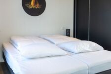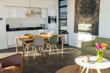 Im 70m² großen Ferienhaus erwartet Euch außerdem ein modernes Tageslichtbad mit Rainshower-Dusche und Gäste-WC im Flur. Der große, helle Wohnbereich ist ausgestattet mit Esstisch und Stühlen, einem gemütlichen Sofa, schwenkbarem TV, Elektro-Kamin sowie zwei gemütlichen Sesseln. Smart-TV und Highspeed-Internet runden das Multi-Media Angebot ab. Die voll ausgestattete Küche ist in den Wohnbereich integriert.
