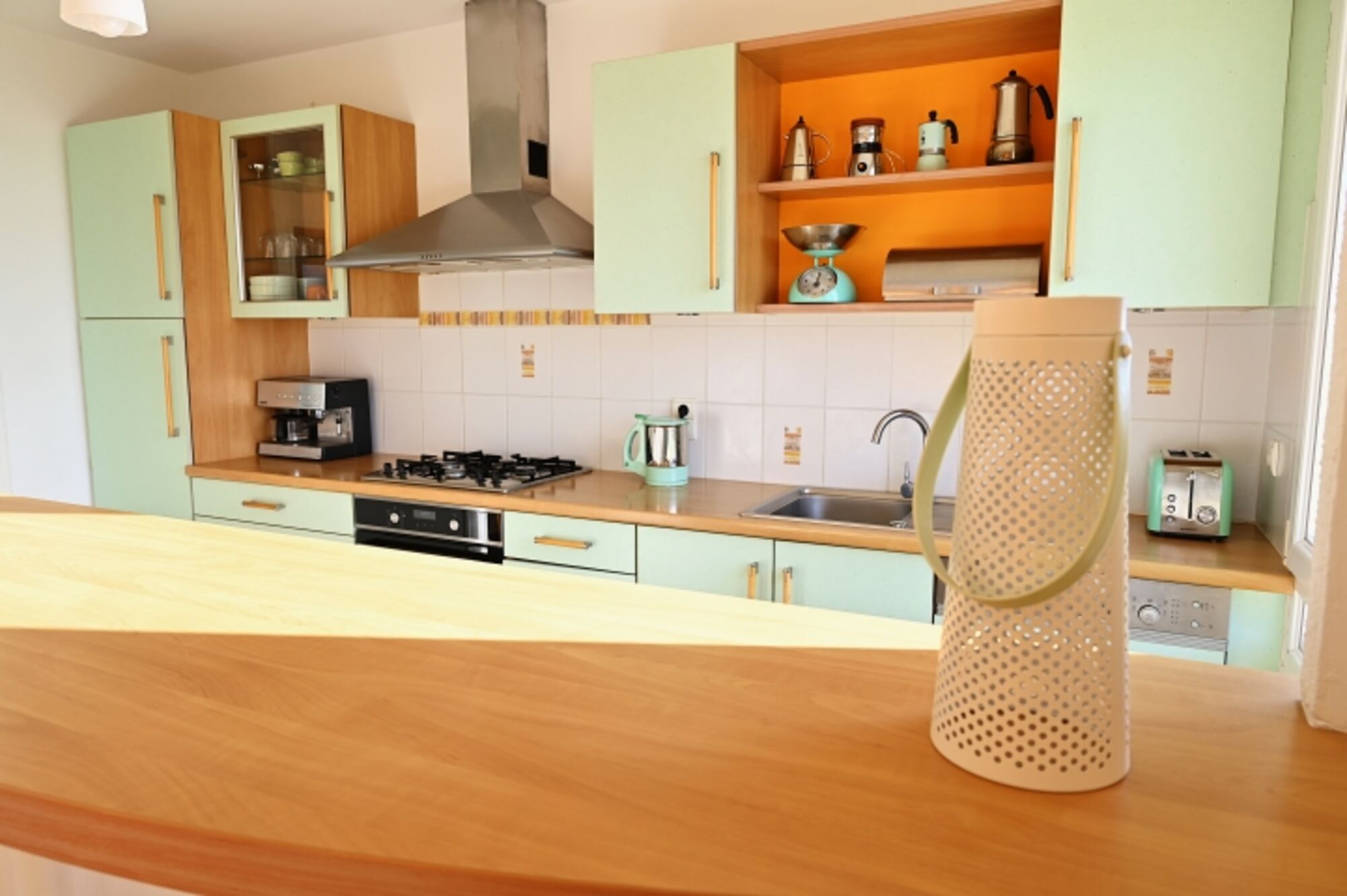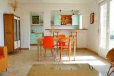 Aus dem Wohn- und Esszimmer im Erdgeschoss hat man einen freien Blick auf das immer andersfarbige Meer. Die zum Wohnzimmer hin offene Küche ist voll ausgestattet mit Spülmaschine, Kühlschrank mit Gefrierfach, Backofen, 4-Flammen-Gaskochfeld mit elektrischer Zündung, Espressomaschine und Moka-Kannen, Mikrowelle, Toaster, Mixer, Küchenmaschinen... Gegenüber liegen zwei Schlafzimmer, eines mit Doppelbett und das andere mit zwei Einzelbetten, die zusammengeschoben werden können. Ebenso ein Badezimmer mit bodengleicher Regendusche und Toilette.
