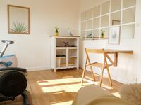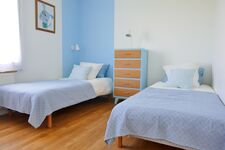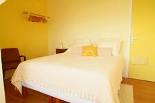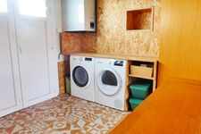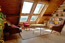 Von dem an die Küche anschließenden Vorraum mit Garderobe, Waschmaschine und Trockner führt eine sichere Holztreppe in die obere Etage. Hier kann man mit einem guten Buch in der Leseecke zum Meer gemütlich sitzen, sich am Kickertisch austoben, auf den beiden Training-Fahrrädern im Fitnessraum mit Meerblick strampeln, Klavier spielen oder auch einen alten Film im Kinoraum genießen. Das Schlafzimmer verfügt über ein Doppelbett und liegt ebenfalls zum Meer hin. Daneben gibt es ein Badezimmer mit Badewanne und einer weiteren Toilette.