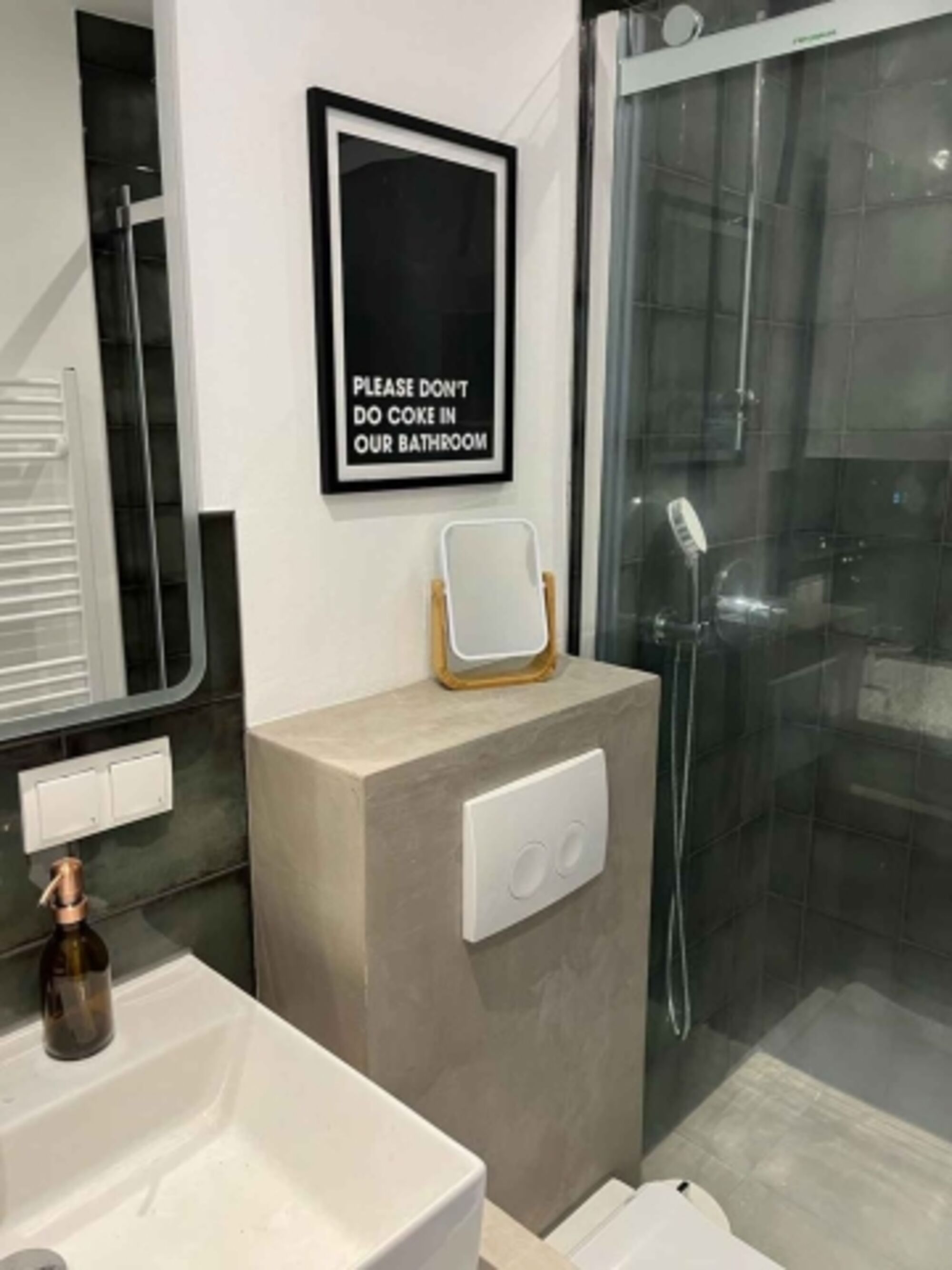 Das Bad verfügt über eine großzügige, bodenebene Dusche und ja, ganz praktisch: Wände hat es auch.