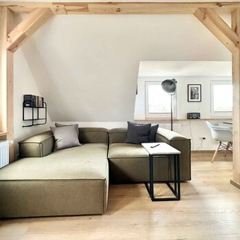 Der offene Grundriss verbindet Kochen, Wohnen und Schlafen zu einem harmonischen Ganzen und sorgt trotz der kompakten Größe für ein überraschend großzügiges Raumgefühl. Insgesamt sechs Fenster öffnen den Raum nach Norden und Osten und lassen viel Licht herein, besonders morgens, wenn die ersten Sonnenstrahlen den Tag begrüßen.
