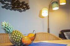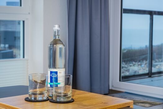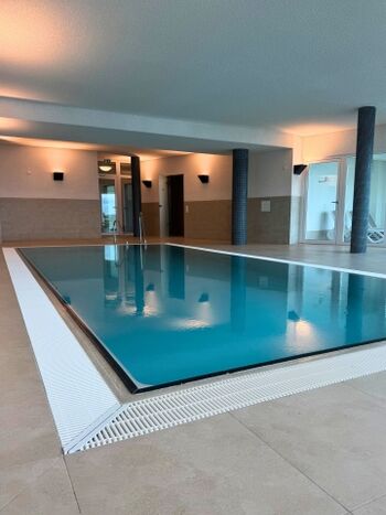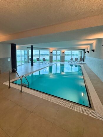 Weitere Ausstattung der Ferienwohnung sind eine voll ausgestattet Küche, ein Fahrradkeller mit Ladestation, sowie ein Waschkeller mit Waschmaschinen und Trockner. Ab den 01.08.2025 hat auch unser Wellnessbereich für euch von 08:00 bis 20:00 täglich geöffnet. Hier hat man einen Indoorpool mit Blick aufs Meer, wie auch von den Liegestühlen und 2 Saunen. Gerade nicht bei perfekten Wettertage eine kleine Alternative, die euch kostenlos als Gast unserer Ferienwohnung zur Verfügung steht.