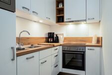 Cerankochfeld, Gasofen / Gasherd, Dunstabzugshaube, Kühlschrank mit Gefrierfach, Senseo-Kaffeeautomat, Eierkocher, Korkenzieher / Flaschenöffner, Mülltüten