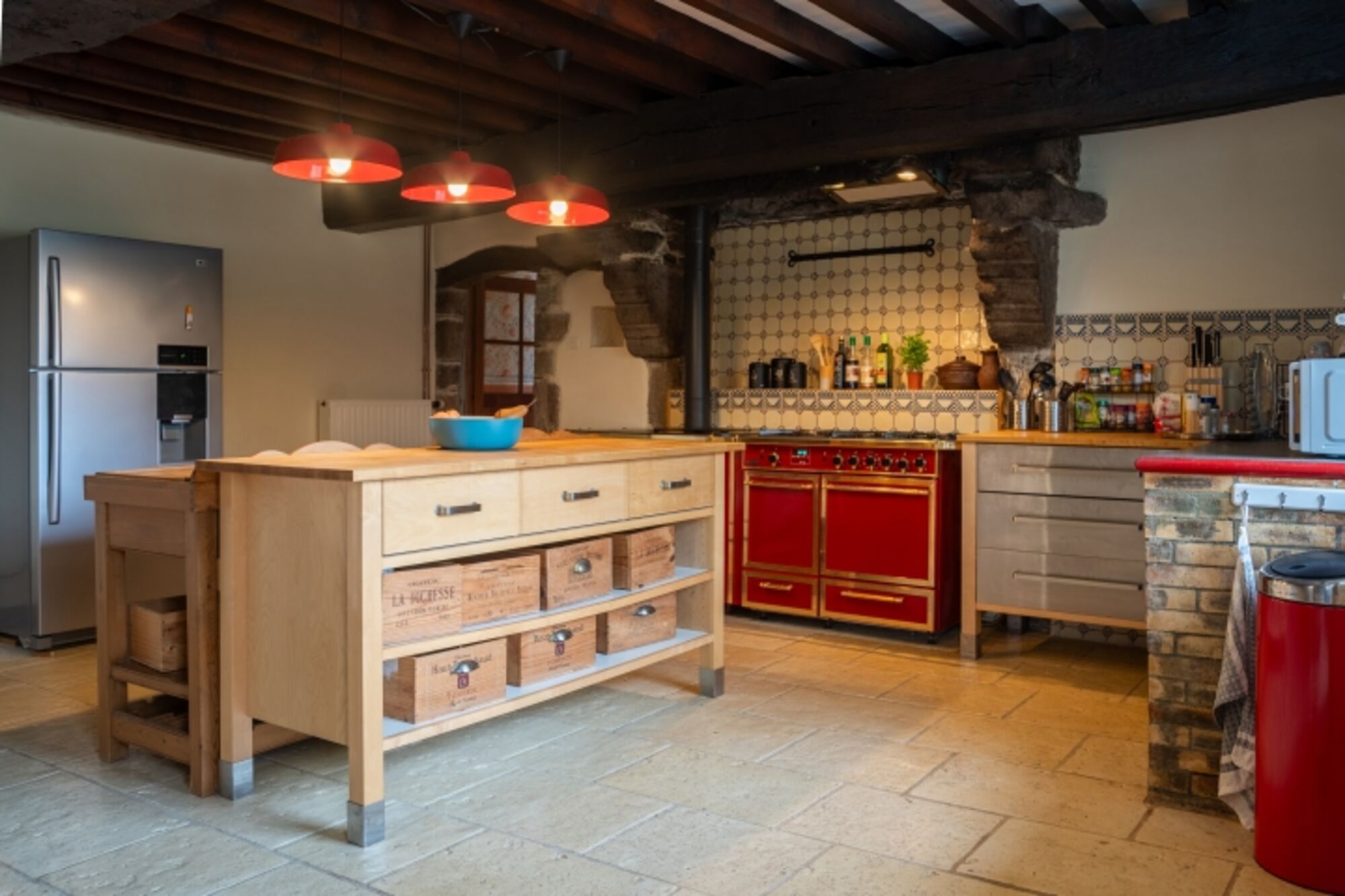 4-Platten Herd, Gasofen / Gasherd, Dunstabzugshaube, Kühlschrank mit Gefrierfach, Nespresso-Automat, Mixer, Korkenzieher / Flaschenöffner, Gewürze (Salz, Pfeffer, Zucker), Öl / Essig, Geschirrhandtücher, Mülltüten