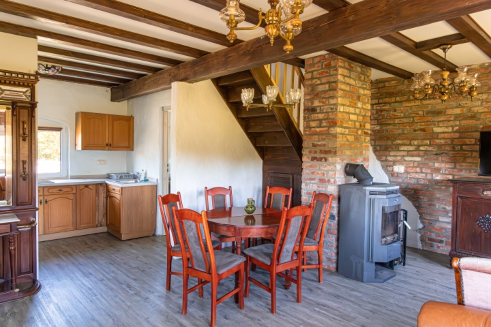 *gemütliches Wohnraum mit Essecke, bequeme Sitzmöglichkeit, LED Fernseher und Kaminofen