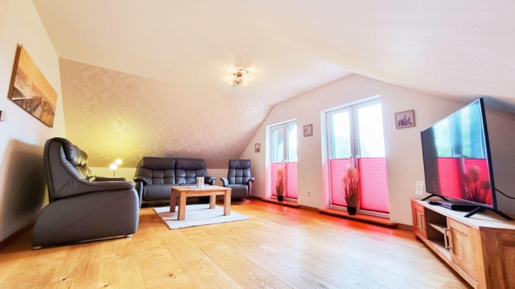 Wohnbereich (OG): 2 Zweisitzer-Ledersofas (elektrisch verstellbar) / Sessel (elektrisch verstellbar / Fernseher / Blick ins Grüne