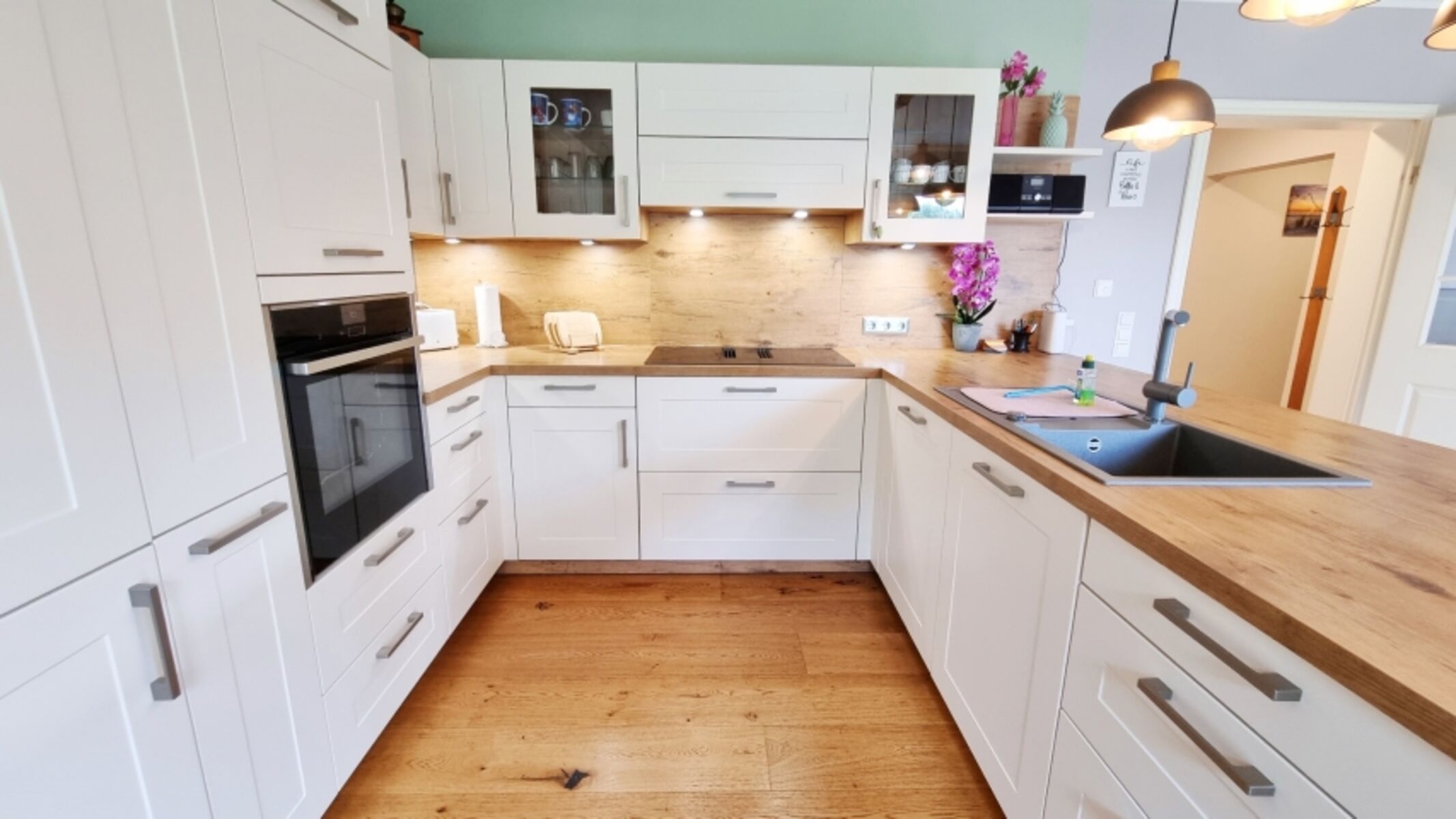 Küche: helle, großzügige Landhausküche / Dunstabzug / Backofen / Geschirrspüler / Toaster / Filterkaffeemaschine / Wasserkocher / Mixer / Kühlschrank / Gefrierschrank