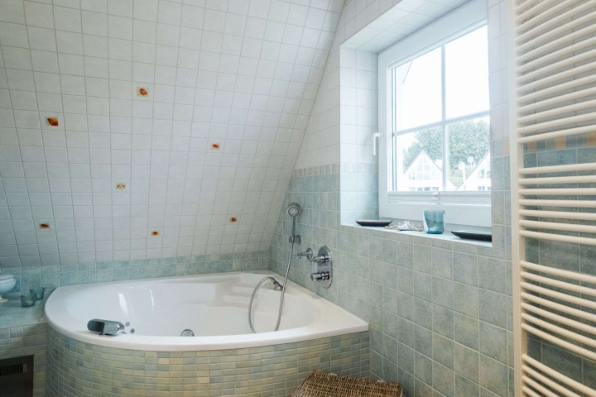 Badewanne mit Whirlpool, Waschbecken, Massagedusche, Kosmetiktücher, Spiegel, Fenster im Bad