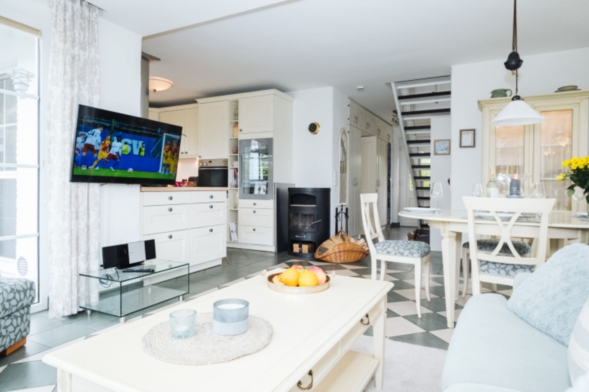 TV-Sat, SMART-TV, TV-Flachbildschirm, HDTV Flachbildschirm, CD-Player, Wii, Bücher, Kaminofen, 3er-Sofa, Sessel, Fliegengitter