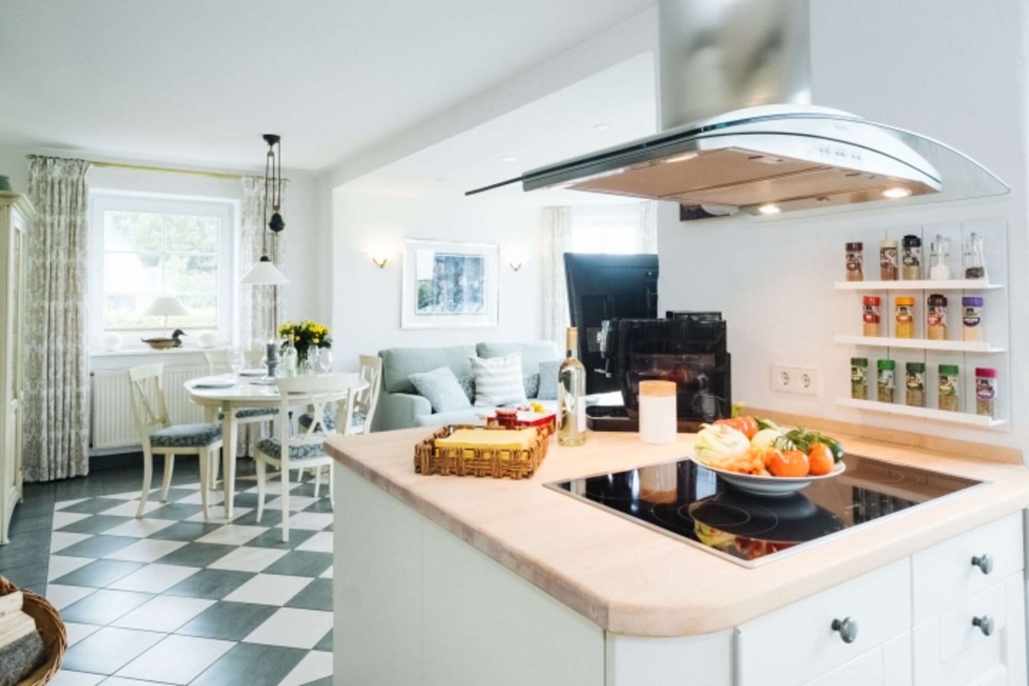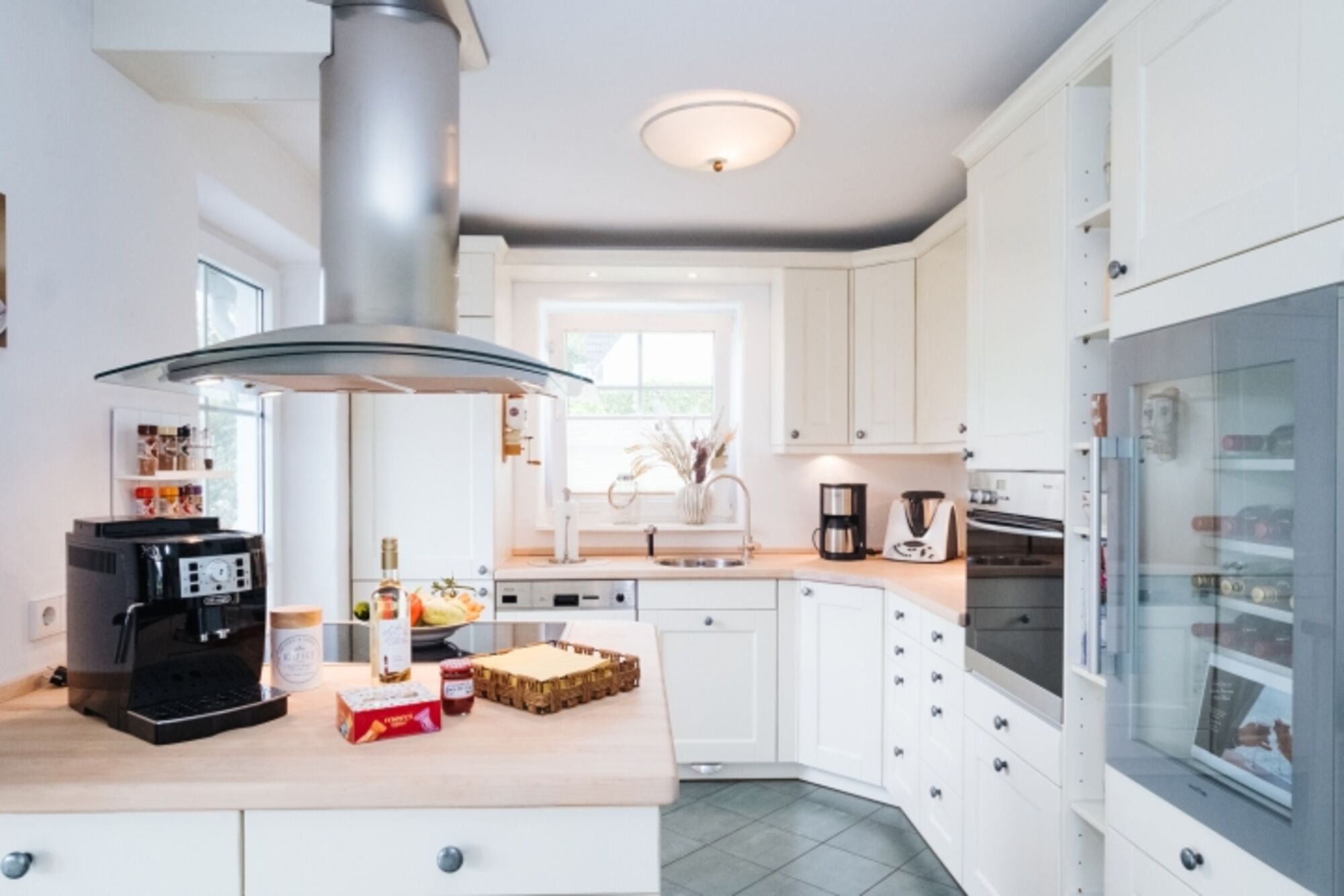 4-Platten Herd, Cerankochfeld, Induktionsherd, Dunstabzugshaube, Kühlschrank mit Gefrierfach, Gefrierschrank, Kaffeevollautomat, Nespresso-Automat, Küchenmaschine, Elekt. Fruchtpresse, Korkenzieher / Flaschenöffner, Gewürze (Salz, Pfeffer, Zucker), Öl / Essig, Geschirrhandtücher, Mülltüten, TV in der Küche