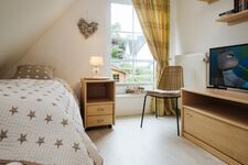 2 Einzelbetten, 90x200 die sich auch nach vorne ausziehen lassen TV im Schlafzimmer, Blick nach Süden Kommode, Spiegel, Leselampe am Bett