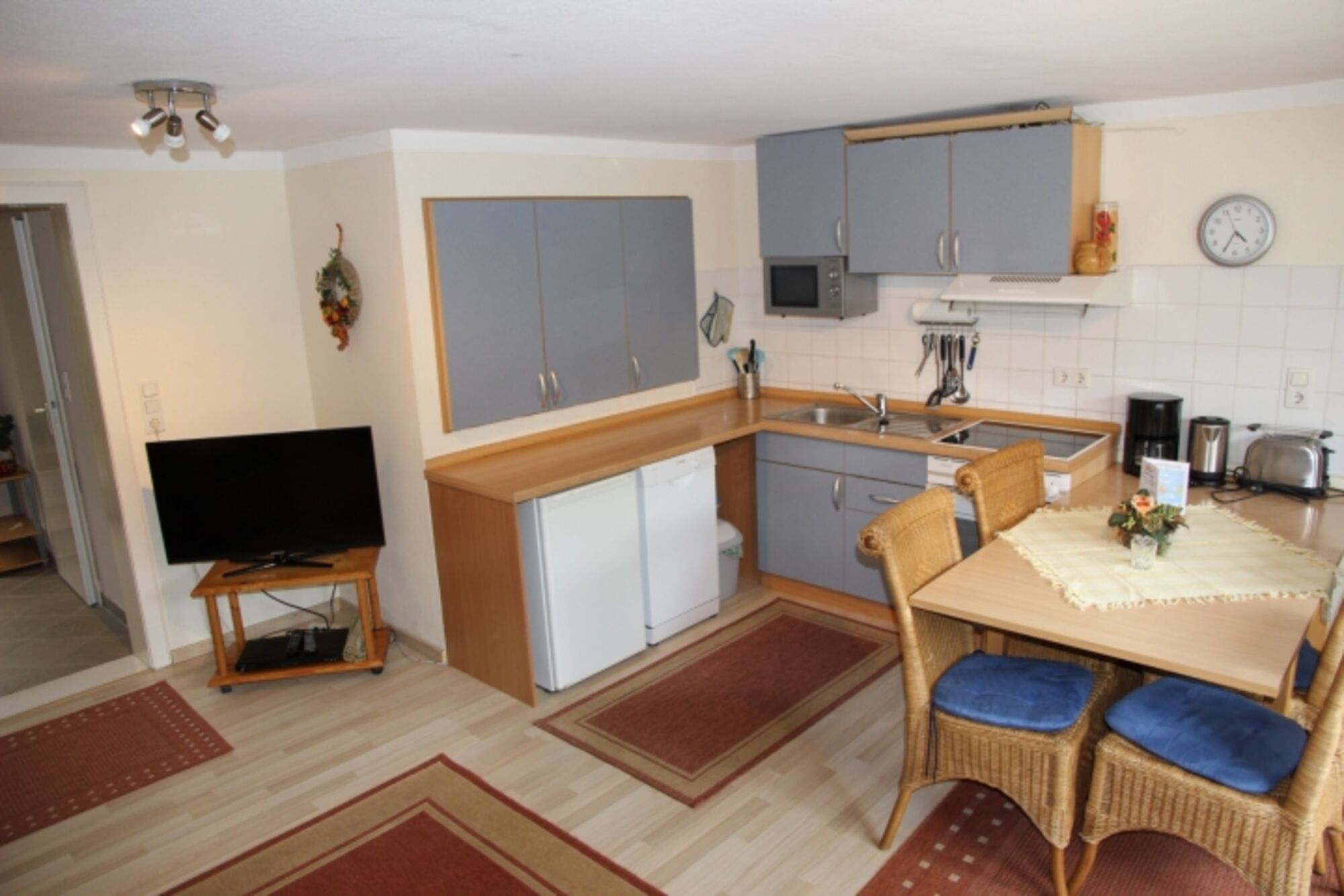 4-Platten Herd, Cerankochfeld, Dunstabzugshaube, Kühlschrank mit Gefrierfach, Mixer, Korkenzieher / Flaschenöffner, Mülltüten, Essplatz in der Küche