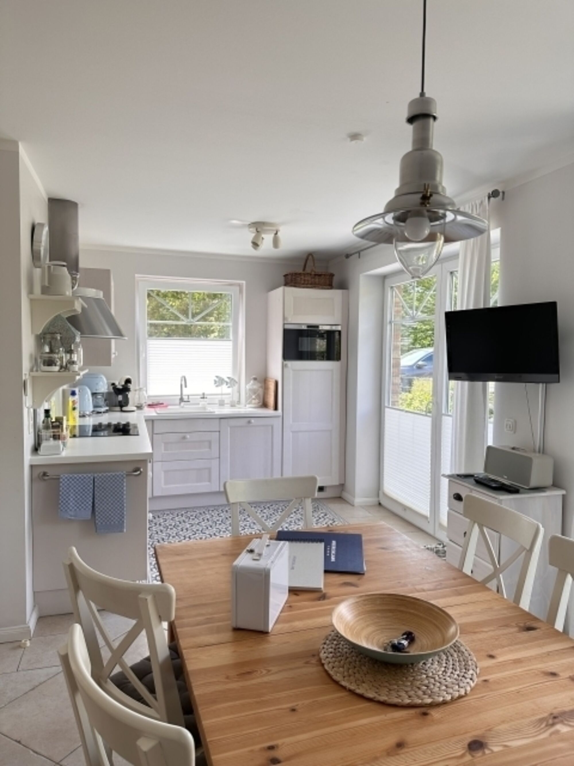 4-Platten Herd, Cerankochfeld, Dunstabzugshaube, Kühlschrank mit Gefrierfach, Tassimo-Kaffeautomat, Eierkocher, Mixer, Gewürze (Salz, Pfeffer, Zucker), Geschirrhandtücher, Mülltüten, Essplatz in der Küche, TV in der Küche