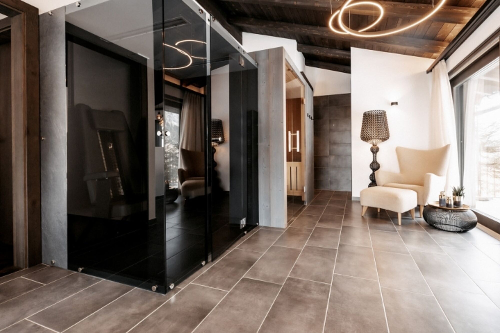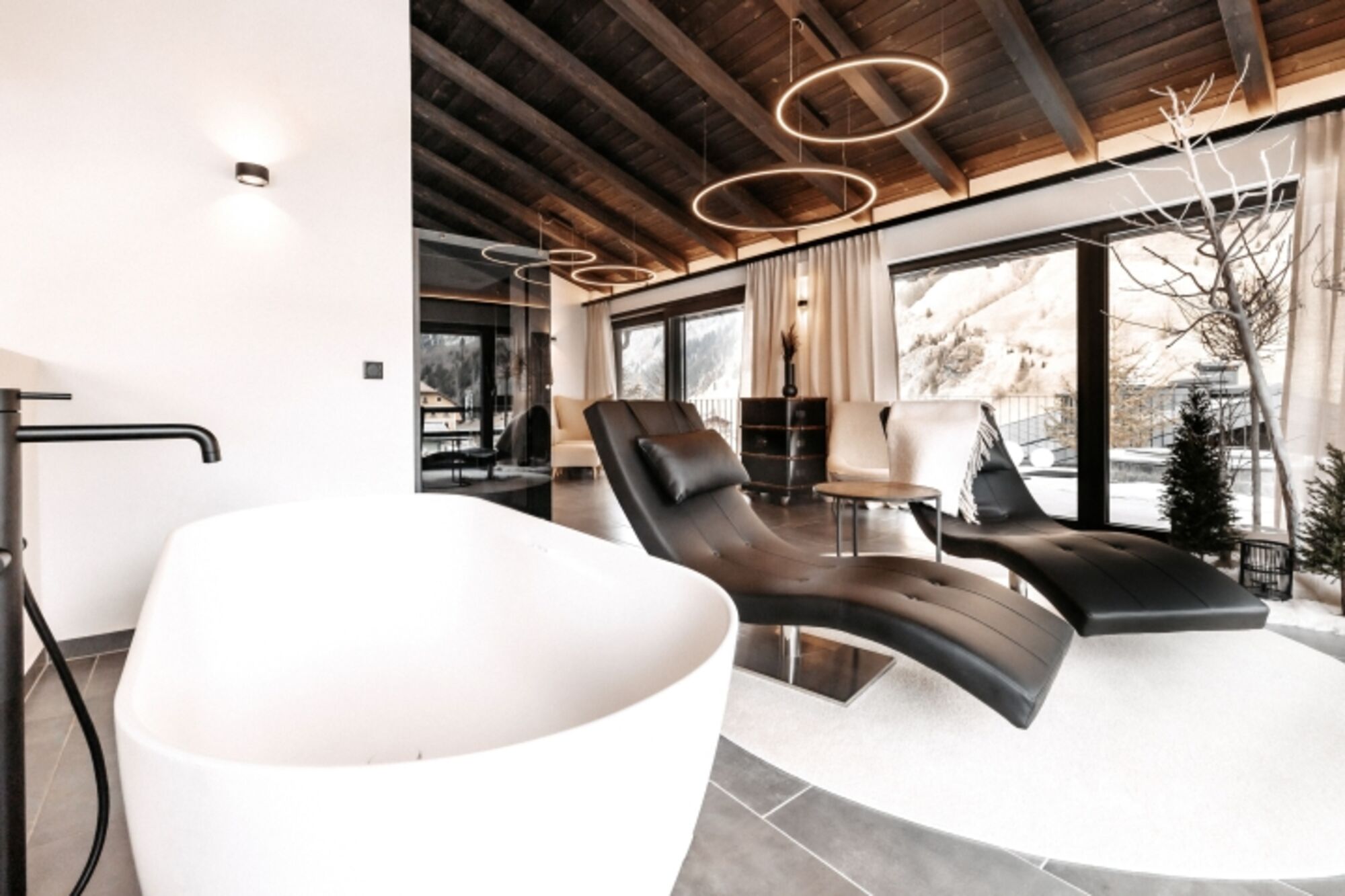 Entspannung ganz nach deiner eigenen Uhr und völlig unabhängig vom Wetter: Im privaten Wellnessbereich samt Infrarotkabine, freistehender Badewanne und stimmungsvollem Ruhebereich schaltest du ab. Daneben garantieren der Hot Tub mit Blick in die Bergwelt und die Außensauna samt Sonnenterrasse ein Wellnesserlebnis der besonderen Art – der ONKL XONNA Art eben.