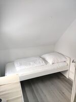 Bettgröße je 90 x 200cm. Ein Bett davon mit Ausziehfunktion und zu einem weiteren Bett. Insgesamt 3 Schlafplätze. Der Raum ist klimatisiert. Einzelbett, Kommode, Wecker, Leselampe am Bett