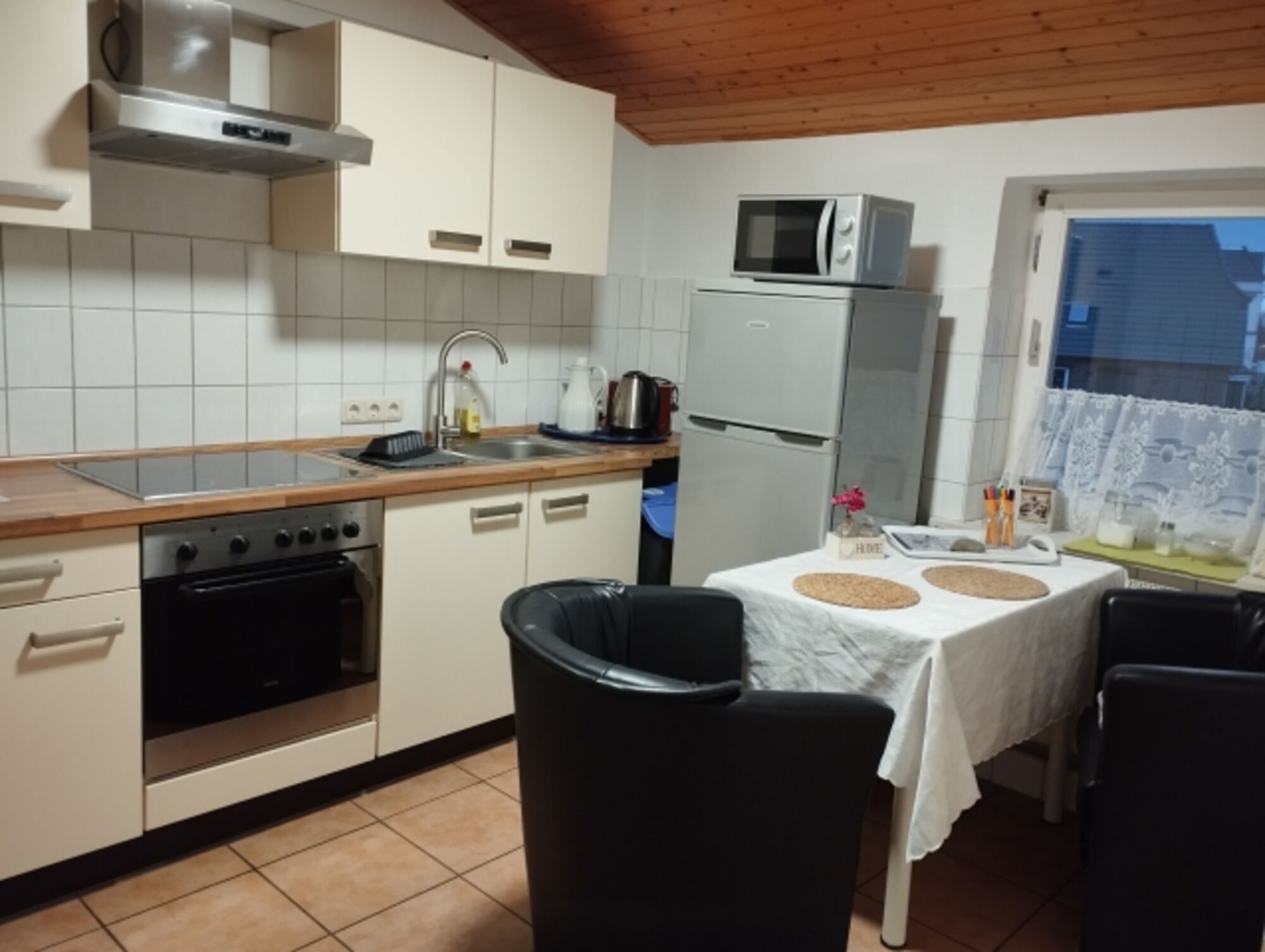 Cerankochfeld, Dunstabzugshaube, Eierkocher, Korkenzieher / Flaschenöffner, Gewürze (Salz, Pfeffer, Zucker), Öl / Essig, Geschirrhandtücher, Mülltüten, Essplatz in der Küche