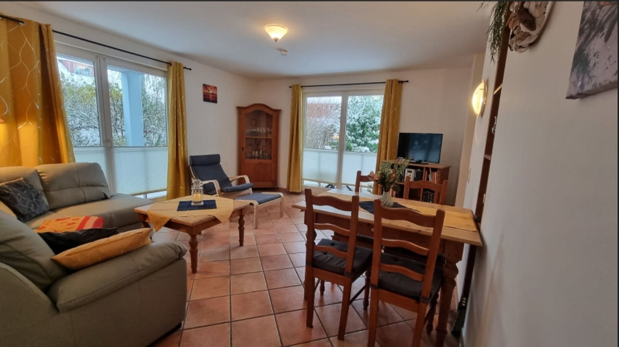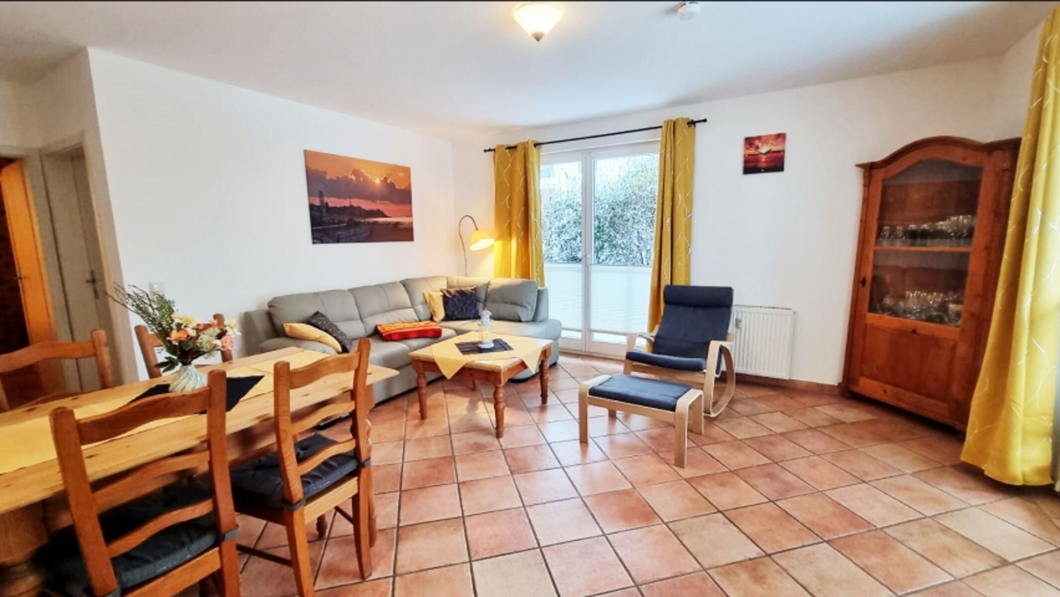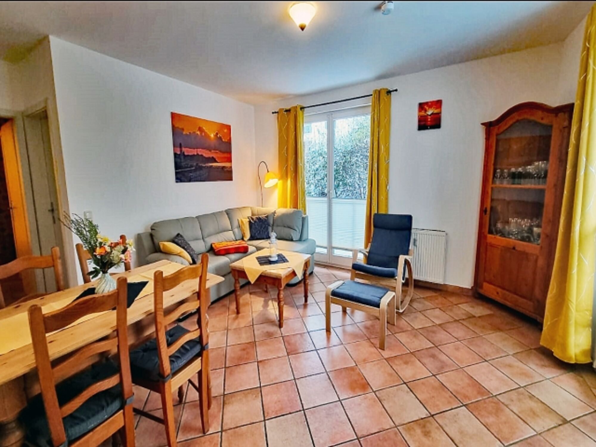 Unsere 3-Raum -Ferienwohnung Cuba 8-2 liegt im Erdgeschoß und ist für 4 Personen mit bis zu 2 Hunden auf einer Wohnfläche von 62 qm gemütlich und zweckmäßig ausgestattet. Über einen kleinen Flur gelangen Sie direkt in den offenen Wohn- und Essbereich. Von der Wohncouch haben Sie einen wunderschönen Blick über die Terrasse hinaus. Unsere begrünte und möblierte Süd-Terrasse verläuft über die westliche Hausseite bis zur Nordseite der Ferienwohnung. Auch die Nordterrasse ist möbliert.
