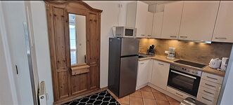 4-Platten Herd, Cerankochfeld, Dunstabzugshaube, Gefrierschrank, Senseo-Kaffeeautomat, Mixer, Korkenzieher / Flaschenöffner, TV in der Küche