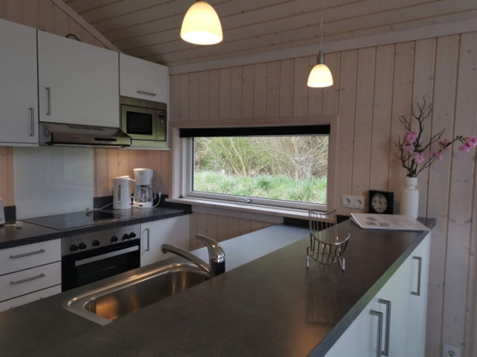 Die voll ausgestattete Küche umfasst eine Spülmaschine, einen Kühlschrank mit Gefrierfach, einen Ceranfeld-Herd, eine Mikrowelle und eine Kaffeemaschine.