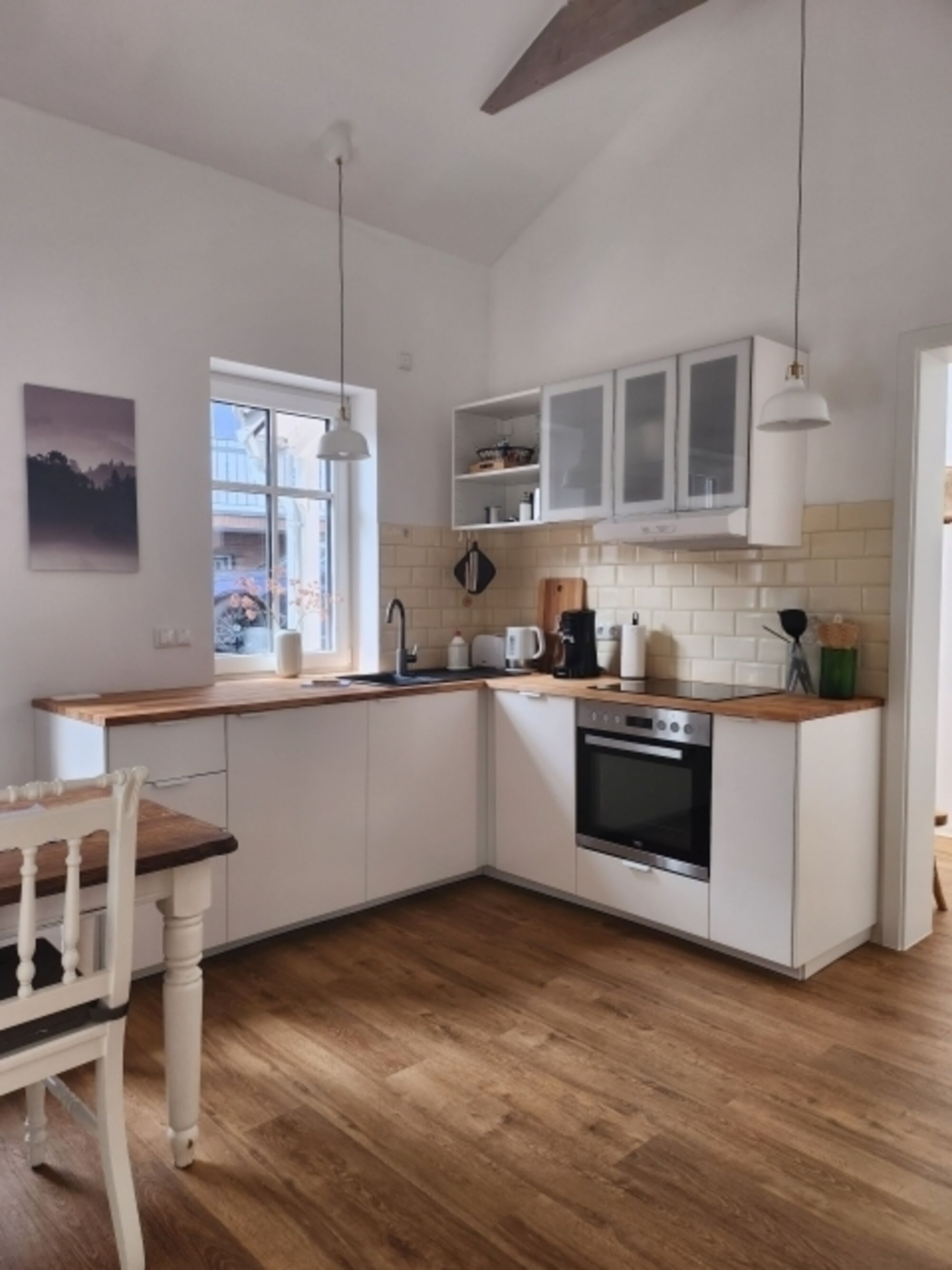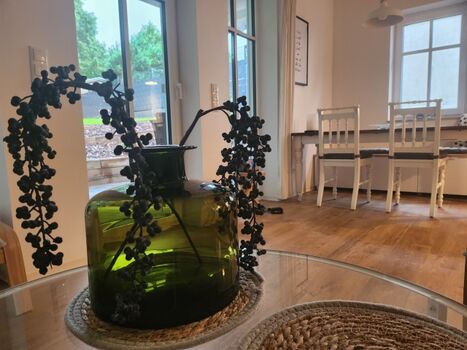4-Platten Herd, Cerankochfeld, Dunstabzugshaube, Gefrierschrank, Senseo-Kaffeeautomat, Waffeleisen, Korkenzieher / Flaschenöffner, Gewürze (Salz, Pfeffer, Zucker), Geschirrhandtücher, Essplatz in der Küche