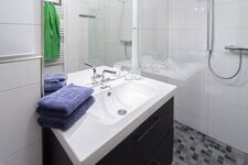 Ferner verfügt der Bungalow über 2 Schlafzimmer (1x mit Doppelbett 180x200cm, 2x Einzelbetten 90x200cm) sowie ein modernes Duschbad.