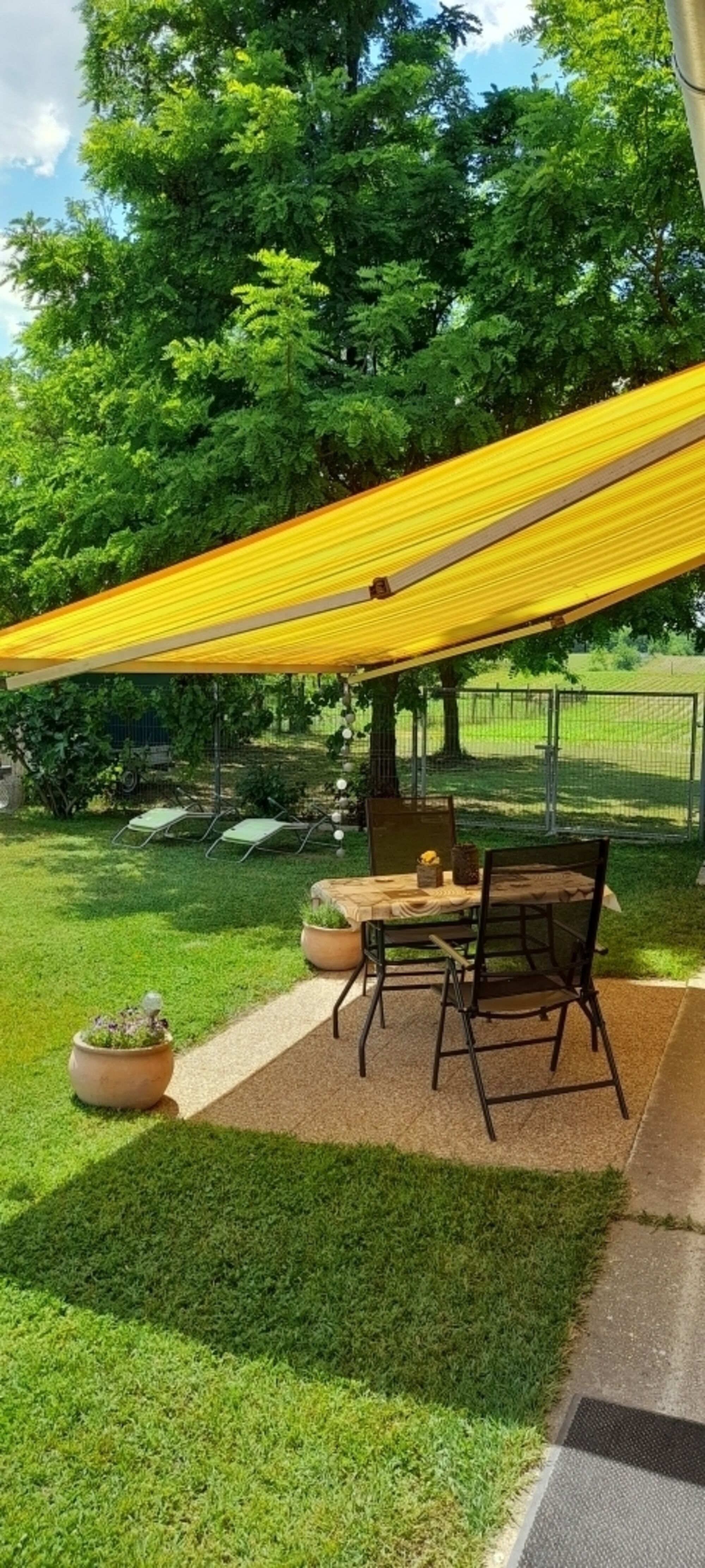 Liegewiese, Gartenmöbel, Kohlegrill, Markise