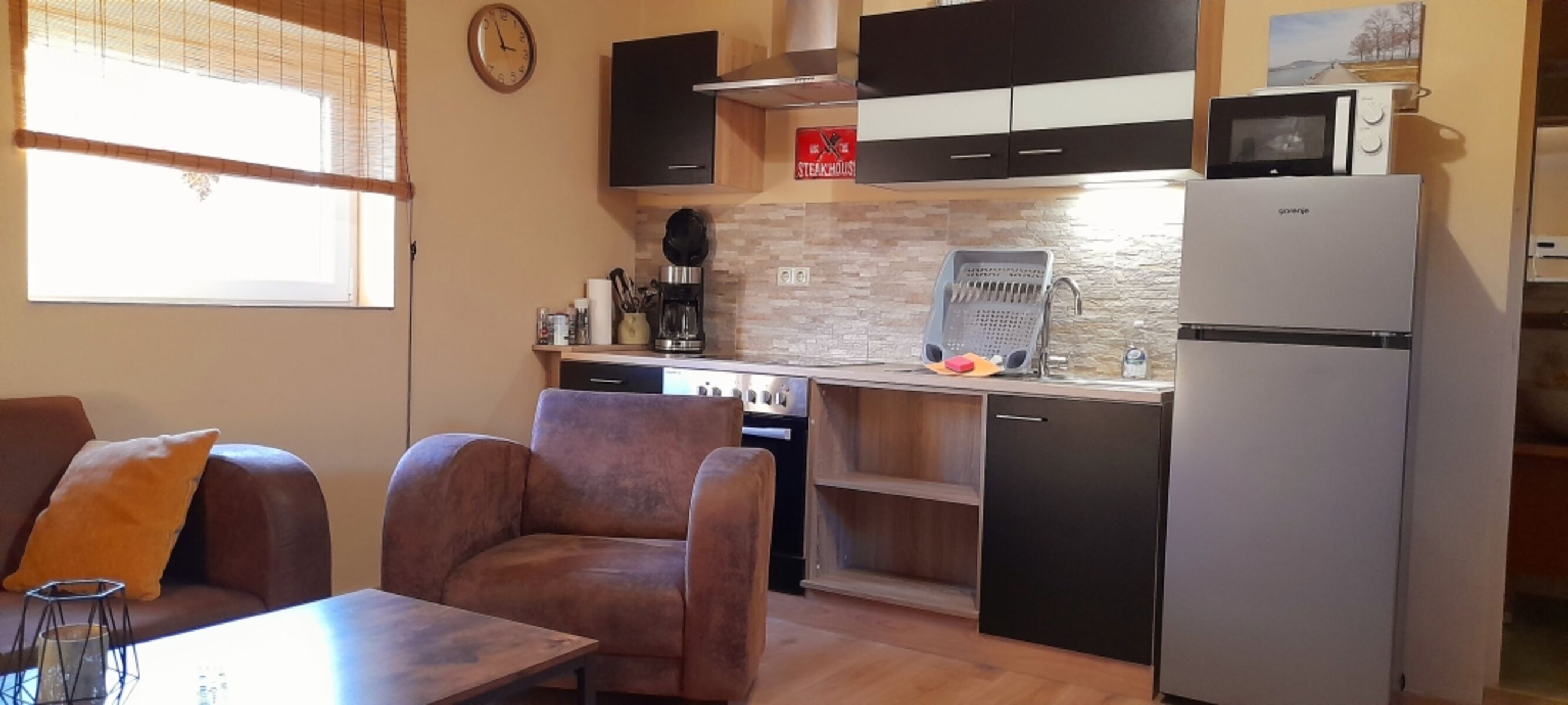 Cerankochfeld, Dunstabzugshaube, Kühlschrank mit Gefrierfach, Korkenzieher / Flaschenöffner, Gewürze (Salz, Pfeffer, Zucker), Geschirrhandtücher, Mülltüten, Essplatz in der Küche, TV in der Küche