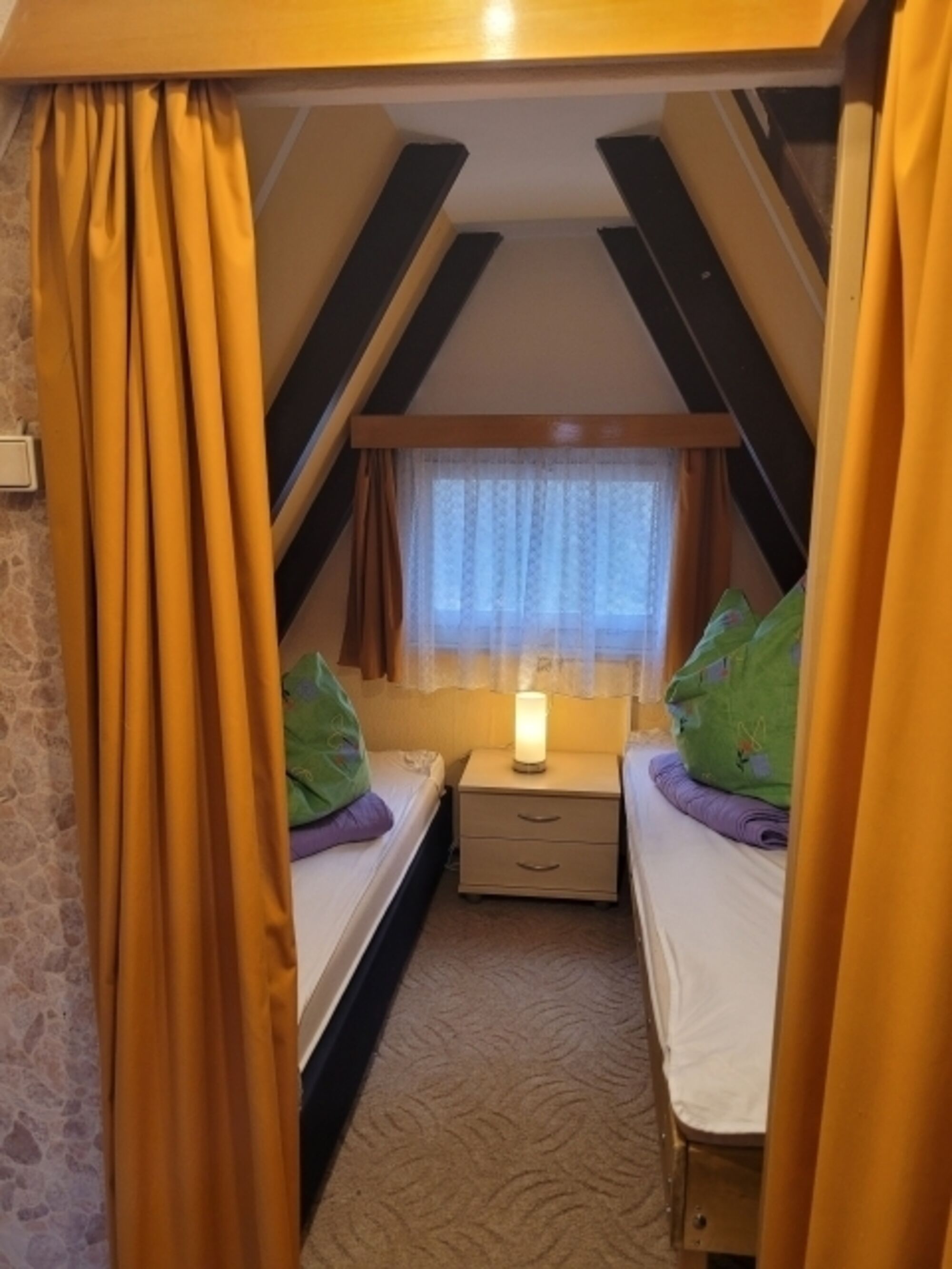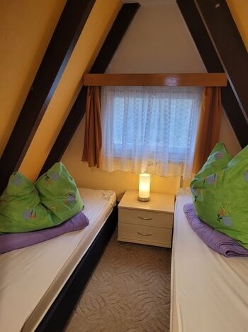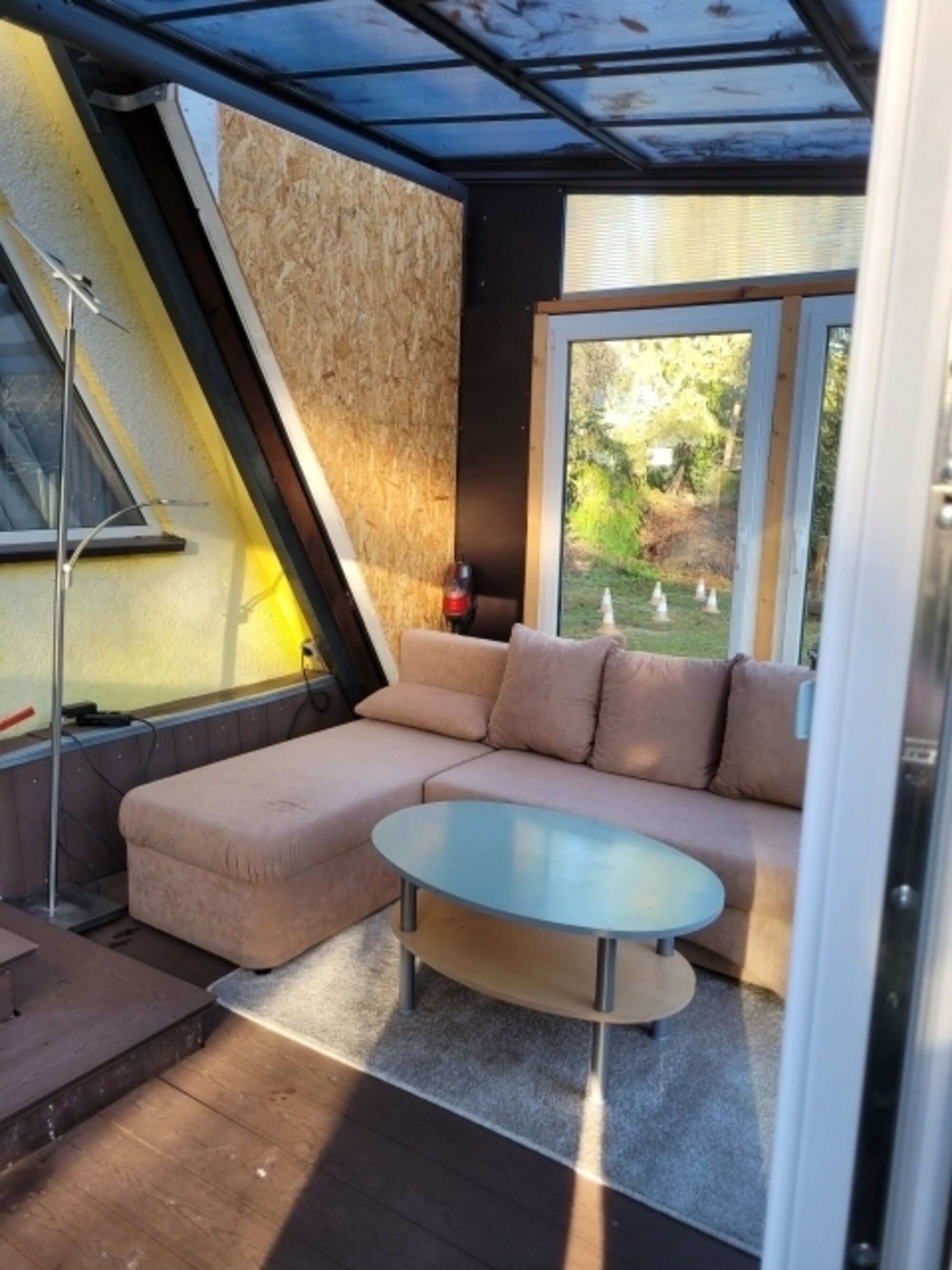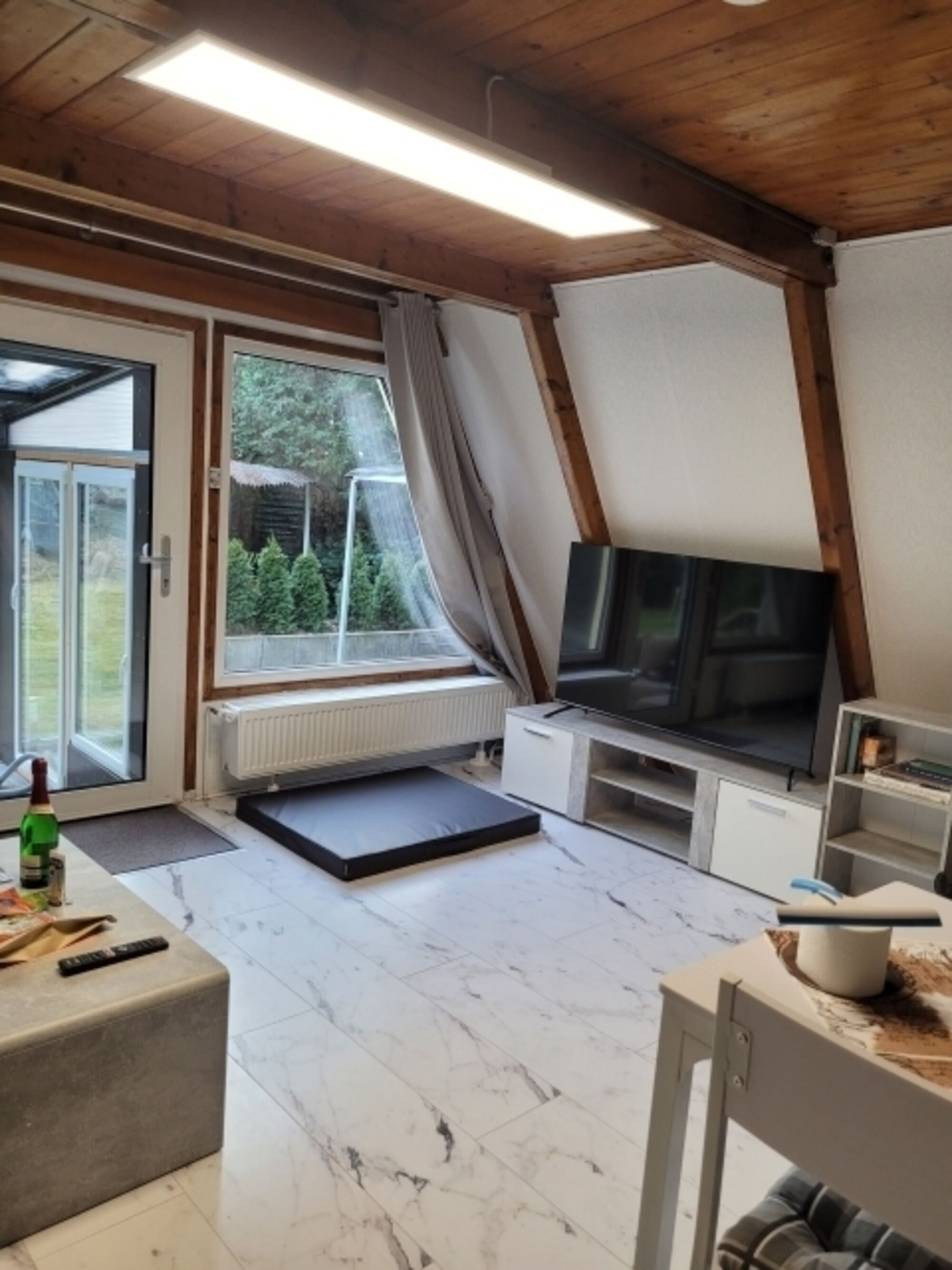 Gemütlich eingerichtetes Finnhaus für max. 4 Personen. Ausgestattet mit einem Wohnraum mit ausziehbarer Couch und klappbarem Bartisch mit 4 Hockern für max 4 Personen, Sat.TV, Küche mit Mikrowelle, Kühlschrank mit Gefrierfach, 2-Platten-Ceranfeld, Toaster, Kaffeemaschine + zusätzlicher Kaffeekapsel-Maschine und Wasserkocher. Einem Duschbad mit WC, sowie zwei separaten Schlafräumen auf der oberen Etage. In dem einen Schlafraum mit Doppelbett und Kommode, im zweiten Schlafraum gegenüber mit einem Einzelbett. Im EG befindet sich ein kleiner Einbau-Kleiderschrank. Kinderbett möglich, bitte bei Buchung angeben. Das Finnhaus steht mit einem weiteren Ferienhaus auf einem ca. 800m² großen, komplett eingezäunten Gemeinschaftsgrundstück. Dieses Grundstück steht zur gemeinschaftlichen Nutzung mit dem Mieter des Ferien-Bungalows zur Verfügung. Jedem Ferienhaus steht ein eigener Grillplatz und ein Pavillon mit Gartenmöbeln zur Verfügung. Das Finnhaus verfügt zusätzlich über einen Wintergarten (12m² Größe ,Baujahr 2022) mit ausziehbarer Couch und einem kleinen Esstisch. Ideal für Hundebesitzer gibt es auf dem Gemeinschaftsgrundstück Trainingsgeräte für Hunde. Zusätzlich befindet sich im Haupthaus eine Tierphysiotherapie Praxis, die von der Vermieterin betrieben wird.
