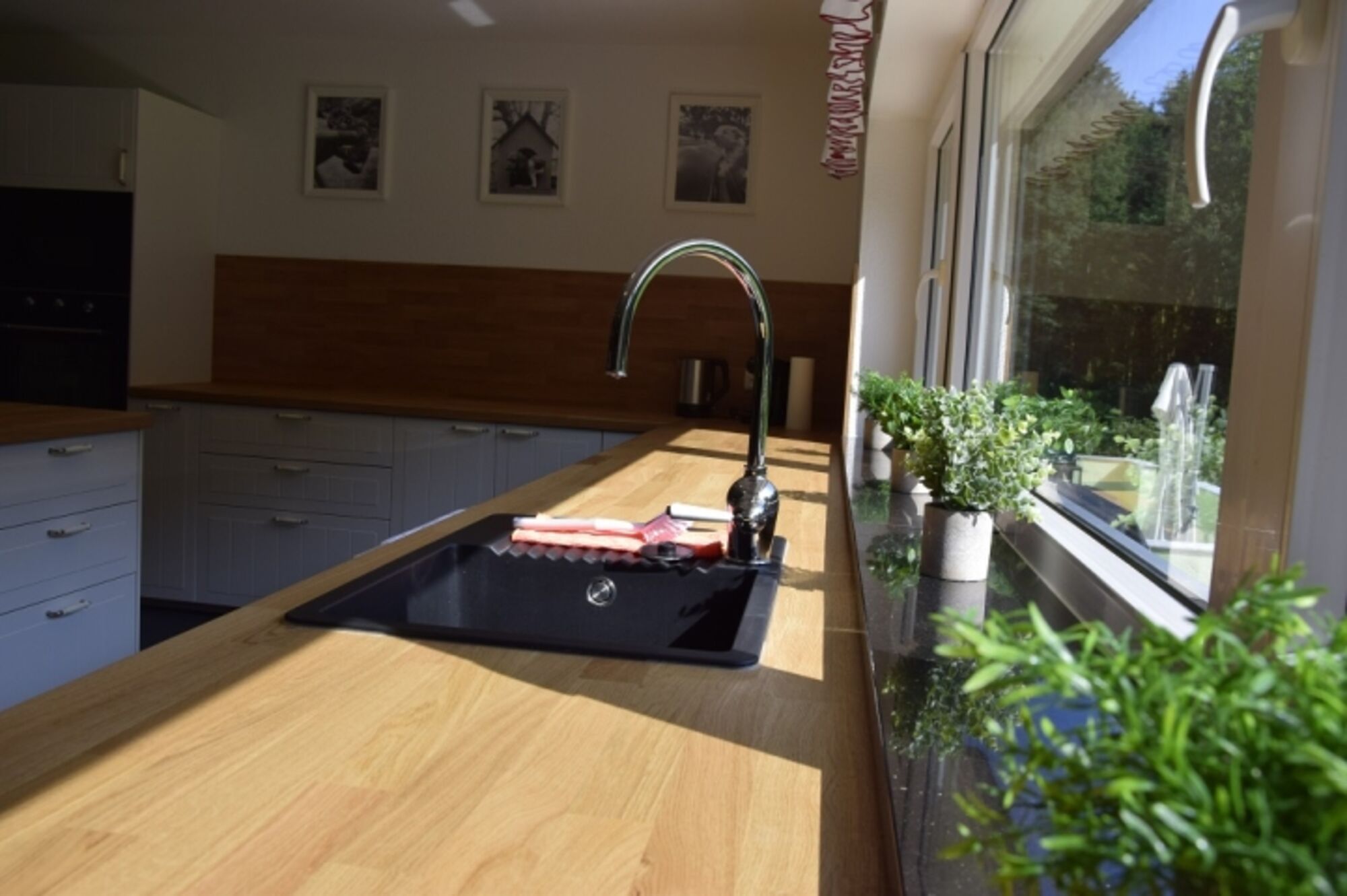 Wunderschöne offene Küche mit großem Essbereich und direktem Blick auf den Wohnbereich mit TV. Von der Küche aus hat man einen herrlichen Blick auf die Terrasse und Wiese.