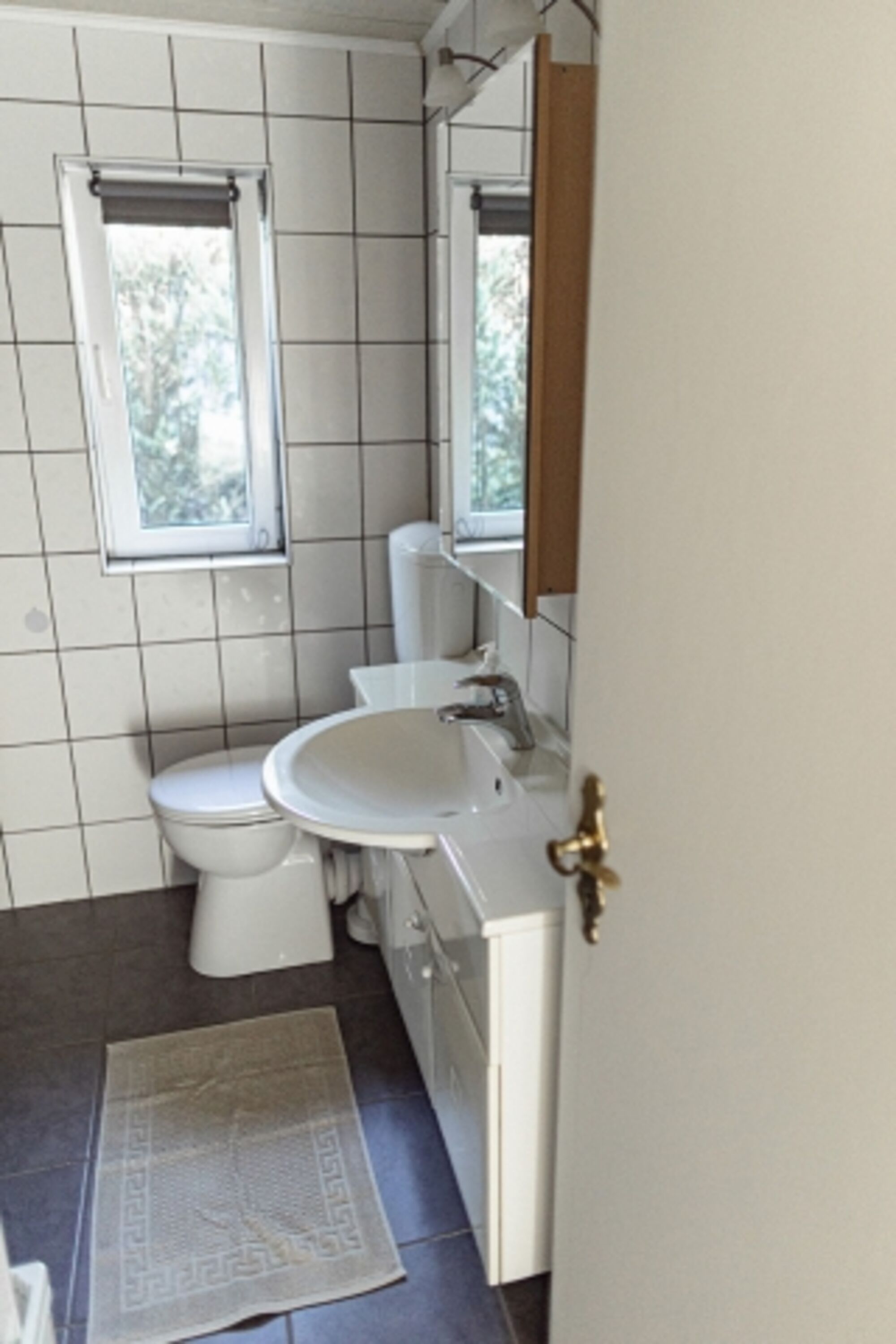 Waschbecken, Spiegel, Fenster im Bad, Fliegengitter