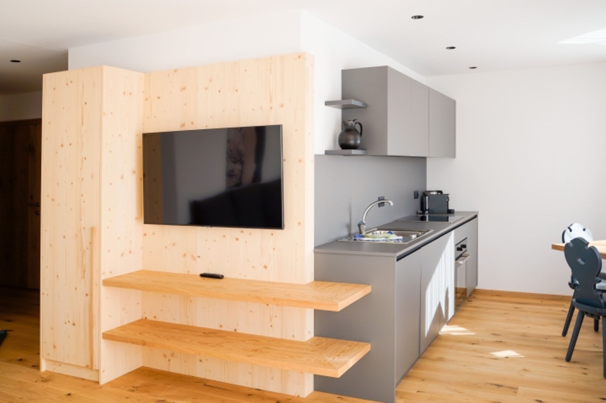 4-Platten Herd, Cerankochfeld, Dunstabzugshaube, Kühlschrank mit Gefrierfach, Gefrierschrank, Kaffeevollautomat, Nespresso-Automat, Korkenzieher / Flaschenöffner, Gewürze (Salz, Pfeffer, Zucker), Öl / Essig, Geschirrhandtücher, Mülltüten, Essplatz in der Küche, TV in der Küche