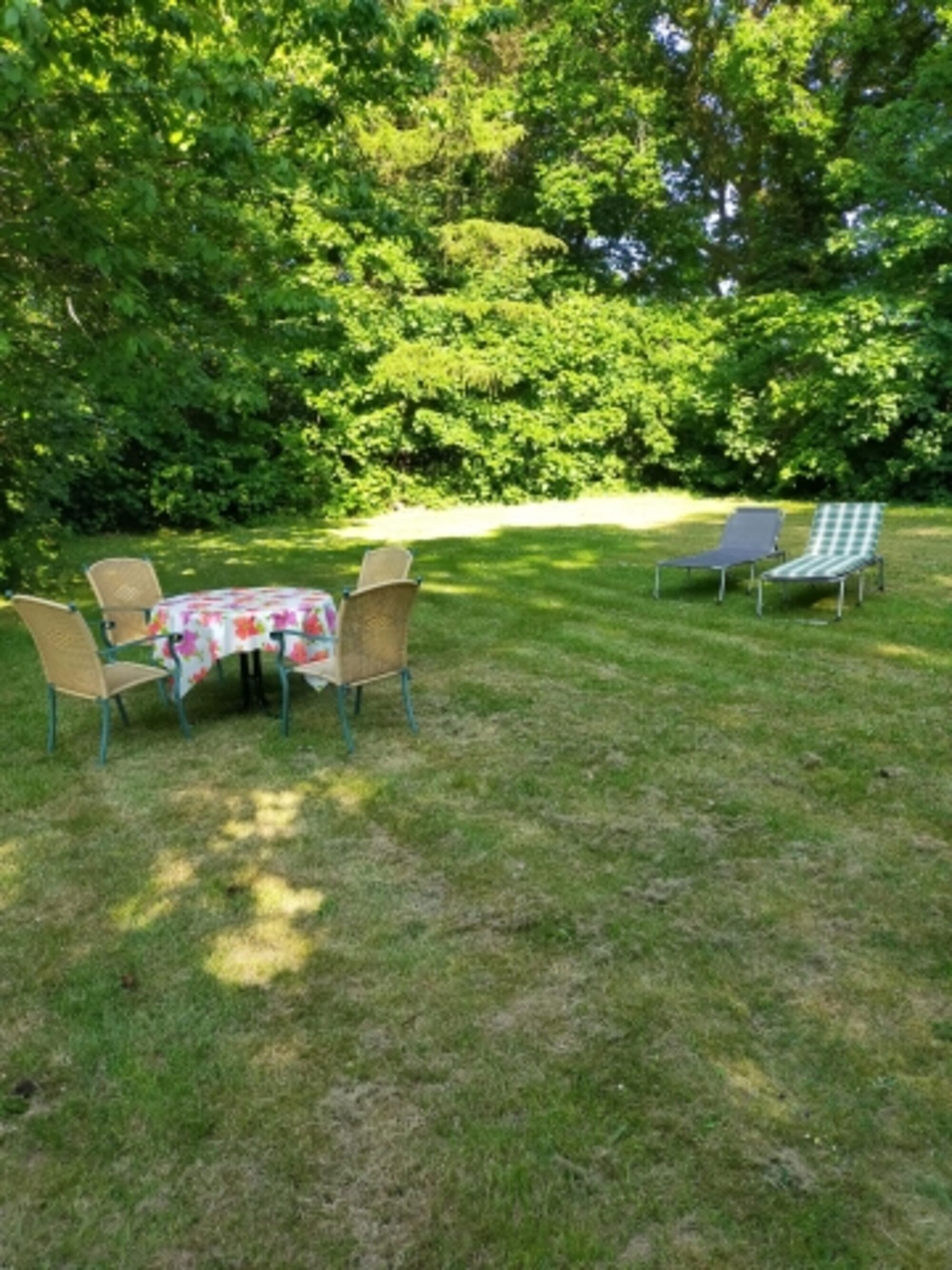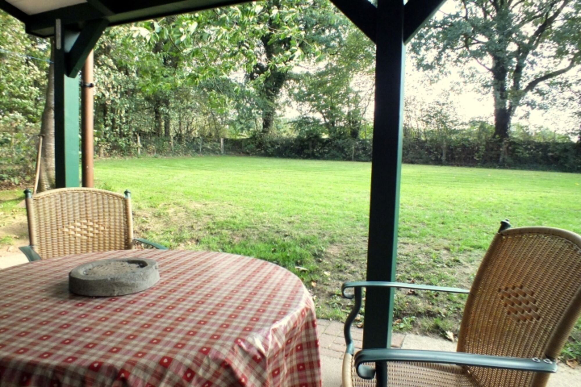 Die überdachte Terrasse mit Gartenmöbeln, eine Spielwiese für Hund, Frauchen und Herrchen bieten viel Platz