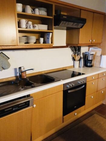 Cerankochfeld, Dunstabzugshaube, Kühlschrank mit Gefrierfach, Gefrierschrank, Eierkocher, Mixer, Korkenzieher / Flaschenöffner, Gewürze (Salz, Pfeffer, Zucker), Öl / Essig, Geschirrhandtücher, Mülltüten, Essplatz in der Küche