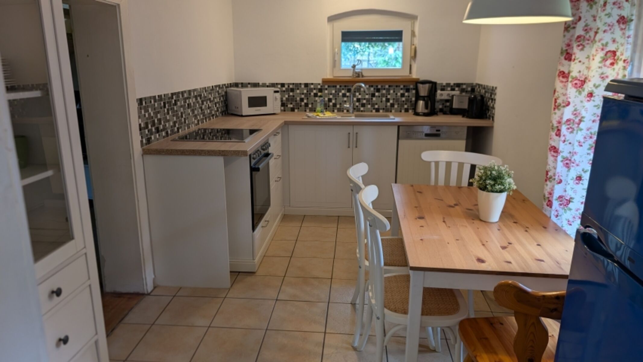 4-Platten Herd, Cerankochfeld, Kühlschrank mit Gefrierfach, Mixer, Korkenzieher / Flaschenöffner, Geschirrhandtücher, Mülltüten, Essplatz in der Küche