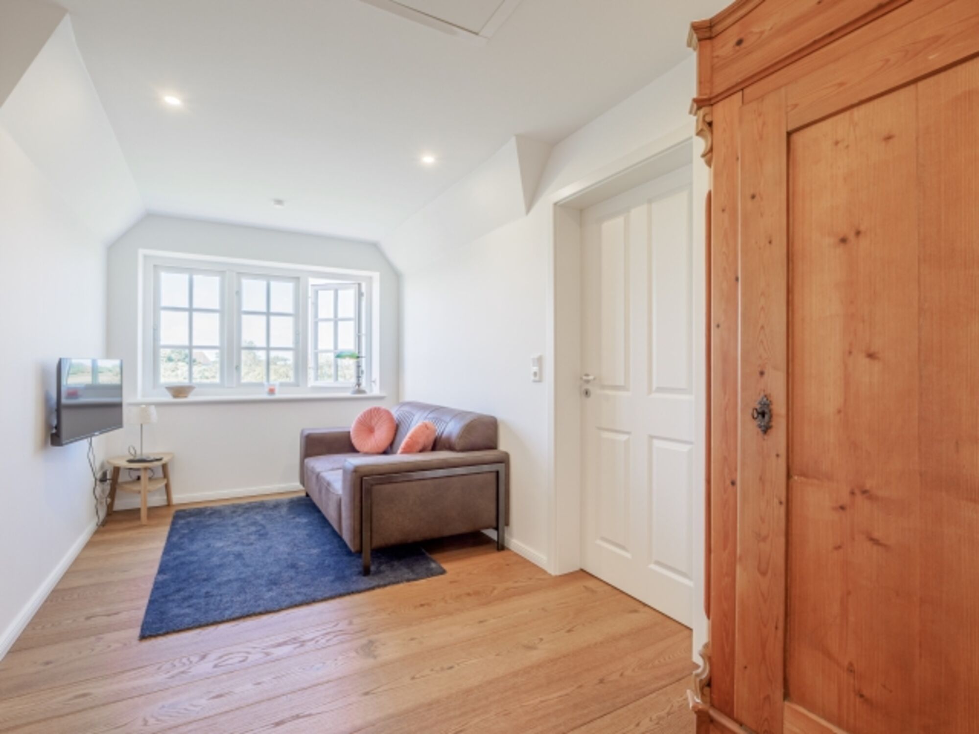 SMART-TV, HDTV Flachbildschirm, DVD-Player, Blu-Ray-Player, Hi-Fi-Anlage mit Bluetooth, Bücher, Kaminofen, Kachelofen, Eckcouch, 3er-Sofa, Fliegengitter