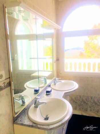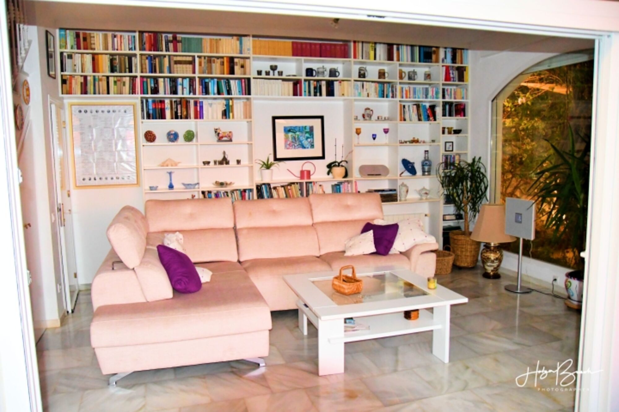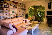 Im Wohnzimmer befindet sich eine große Eckcouch und ein Couchtisch direkt am Kamin. Von dort kann man die Sicht auf Malaga geniessen und fernsehen (deutsche Programme), Musik (CD, DVD, MP3, I-Pod) hören oder Filme sehen (Apple TV, Soundbar). Unter der Treppe befindet sich eine zusätzliche Toilette und ein Schrank mit Spielen. Die Regalwand enthält hunderte von Büchern.
