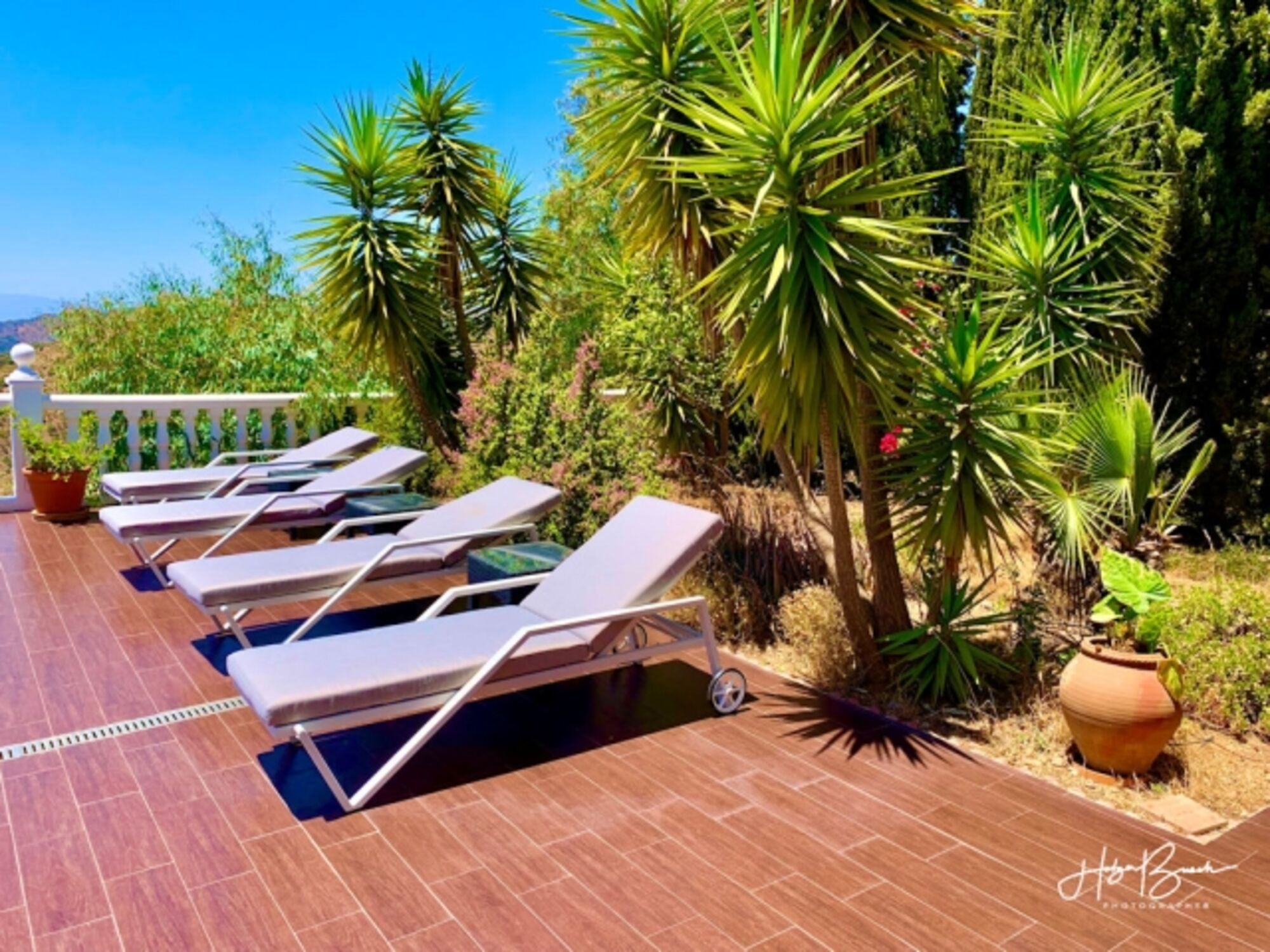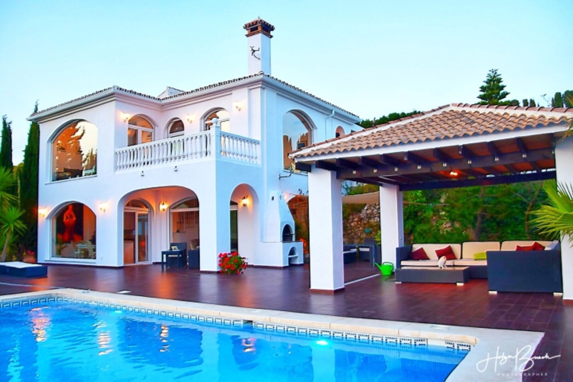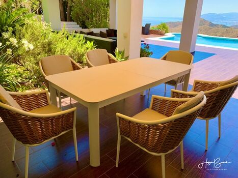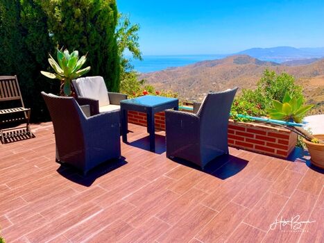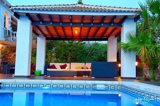Das Grundstück ist 8500m² groß. Der obere Teil (1000m²) ist eingezäunt. Die Terrasse zwischen Pool und Haus beträgt ca. 200m². Von dort können Sie das Lichtermeer von Málaga bewundern oder den Einlauf der Kreuzfahrtschiffe in den Hafen beobachten. Eine große Lounge-Couch, ein Esstisch für 8 Personen, 4 Liegestühle und eine kleiner Tisch stehen im Außenbereich zur Verfügung. Die Pergola sorgt als zusätzlichen Sonnenschutz für Schatten auf der Couch und ein Sonnensegel für den Essbereich. Ein Grill ist ebenfalls vorhanden.