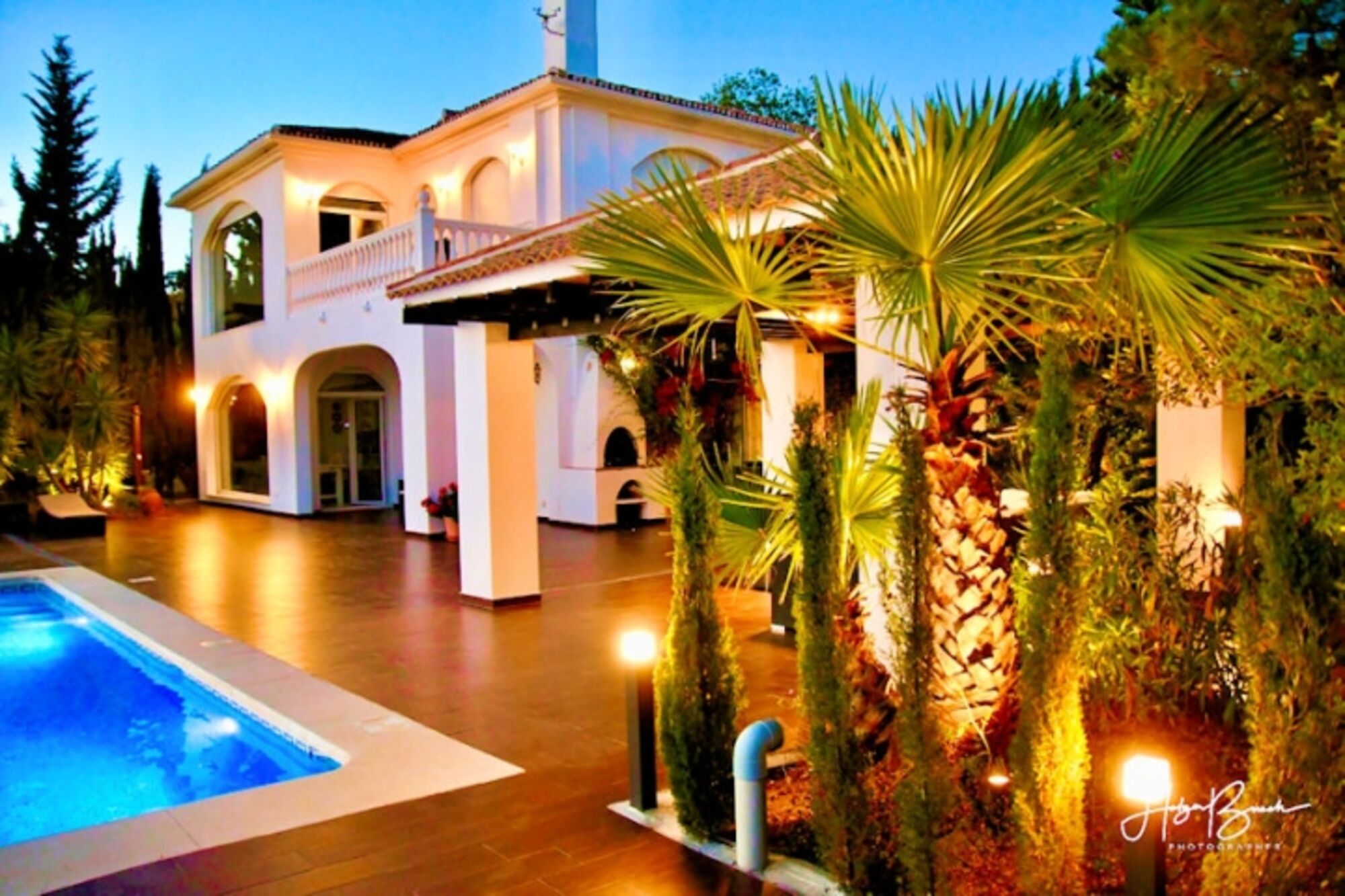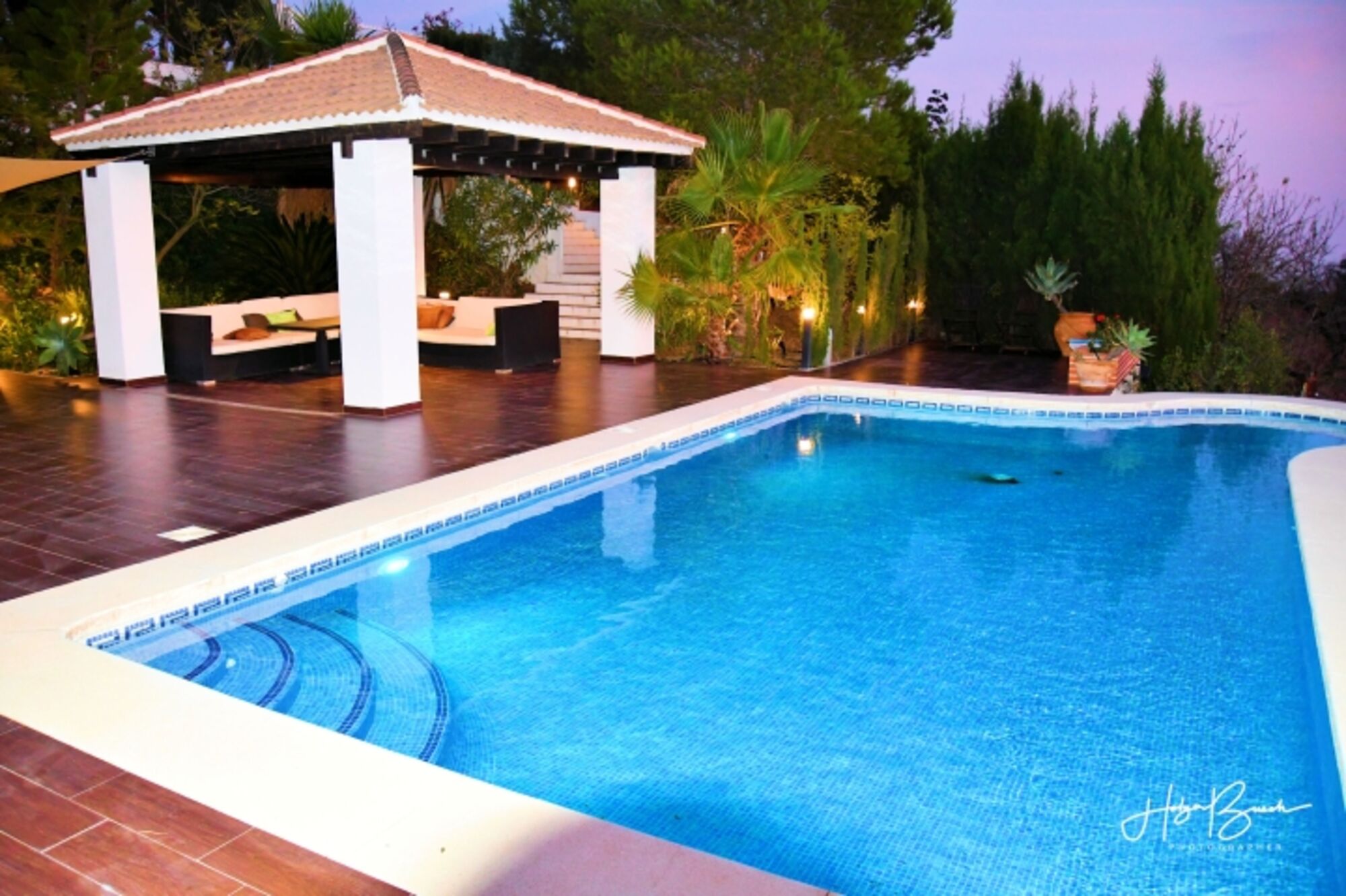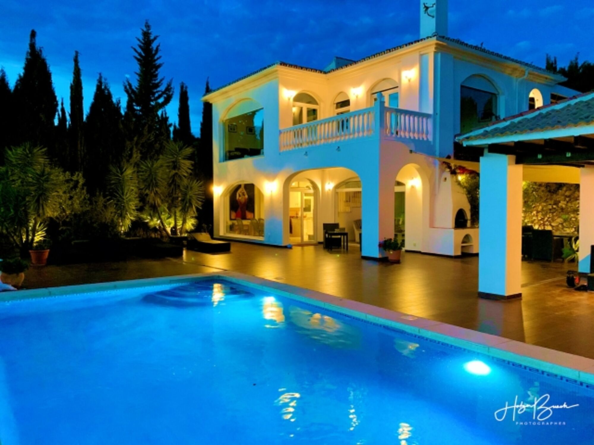Das Grundstück ist 8500m² groß. Der obere Teil (1000m²) ist eingezäunt. Die Terrasse zwischen Pool und Haus beträgt ca. 200m². Von dort können Sie das Lichtermeer von Málaga bewundern oder den Einlauf der Kreuzfahrtschiffe in den Hafen beobachten. Eine große Lounge-Couch, ein Esstisch für 8 Personen, 4 Liegestühle und eine kleiner Tisch stehen im Außenbereich zur Verfügung. Die Pergola sorgt als zusätzlichen Sonnenschutz für Schatten auf der Couch und ein Sonnensegel für den Essbereich. Ein Grill ist ebenfalls vorhanden.