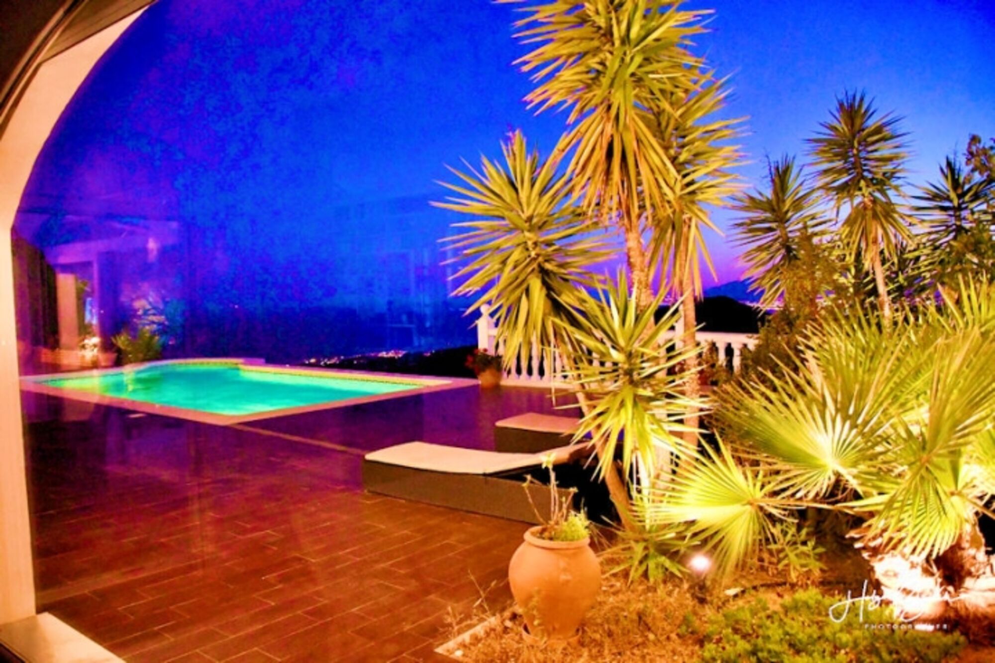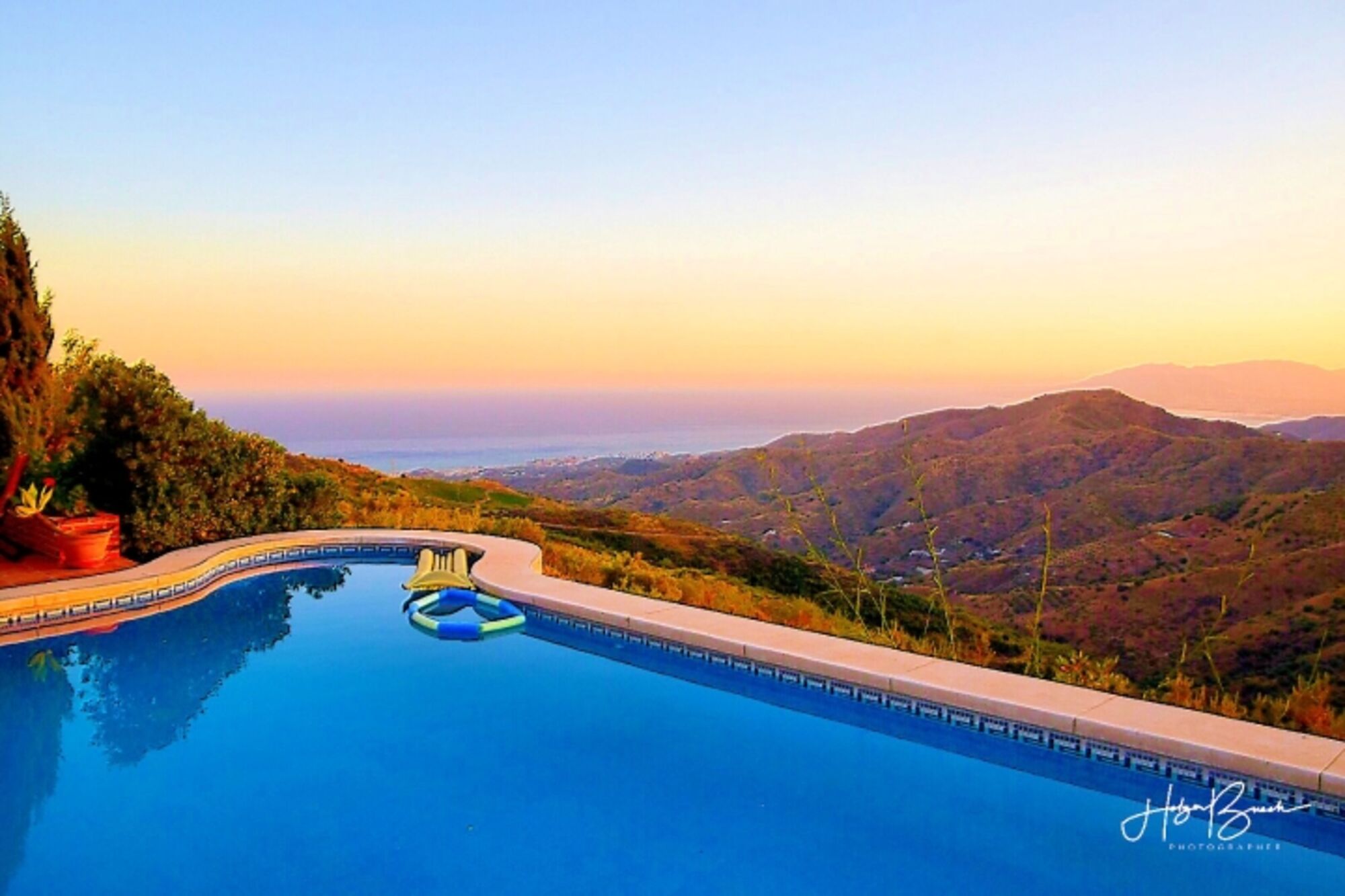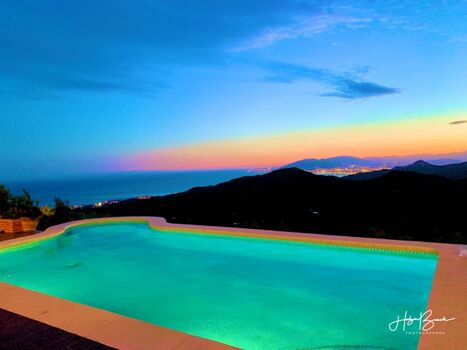 Der beheizbare Pool hat eine interessante Form. In der Rundung ist ein Sitzbank eingebaut, so dass man dort sein Gläschen (natürlich mit Plastikbecher) im Pool mit der Aussicht geniessen kann. Die Größe beträgt ca. 10 x 5m. Die Aussicht vom Pool ist atemberaubend. Bei guter Sicht kann man Afrika sehen. Bei normaler Sicht schaut man auf das Mittelmeer, Malaga und die Schlucht mit Wein, Oliven und Mandeln. Der Pool befindet sich ebenerdig zum Haus. Die Pooltechnik wurde 2019 erneuert. Alle Funktionen des Pools lassen sich jetzt über das Internet steuern. Das Poollicht kann man individuell einstellen. Der Pool kommt ohne Chlor aus.