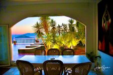 Das Eßzimmer besteht aus einem großen Holztisch mit 6 Stühlen. Der Tisch ist erweiterbar für insgesamt 12 Personen. Das Zimmer ist neben der offenen Küche und bildet mit dem Wohnzimmer eine Einheit. Das Eßzimmer wird normaler Weise nur im Winter benutzt, da man ansonsten im Freien speist. Vom Esszimmer geht es auf die Terrasse. Man hat von allen Fenstern einen Ausblick auf das Mittelmeer und den Garten und manchmal auch nach Afrika. 2019 wurden neue Panoramafenster eingebaut.