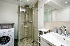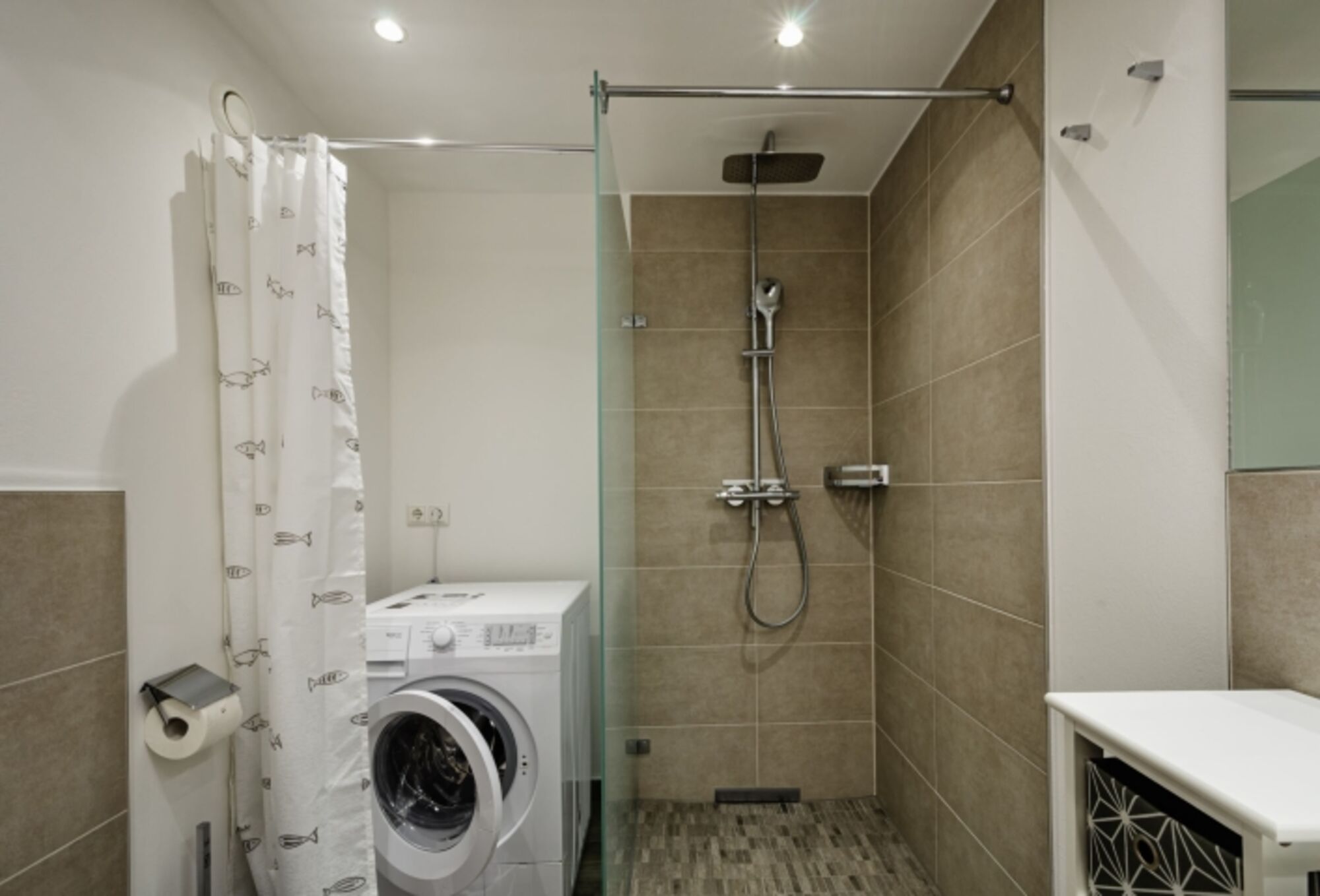 Badezimmer: Ein modernes Badezimmer mit Dusche, WC, Haartrockner und einer praktischen Waschmaschine.