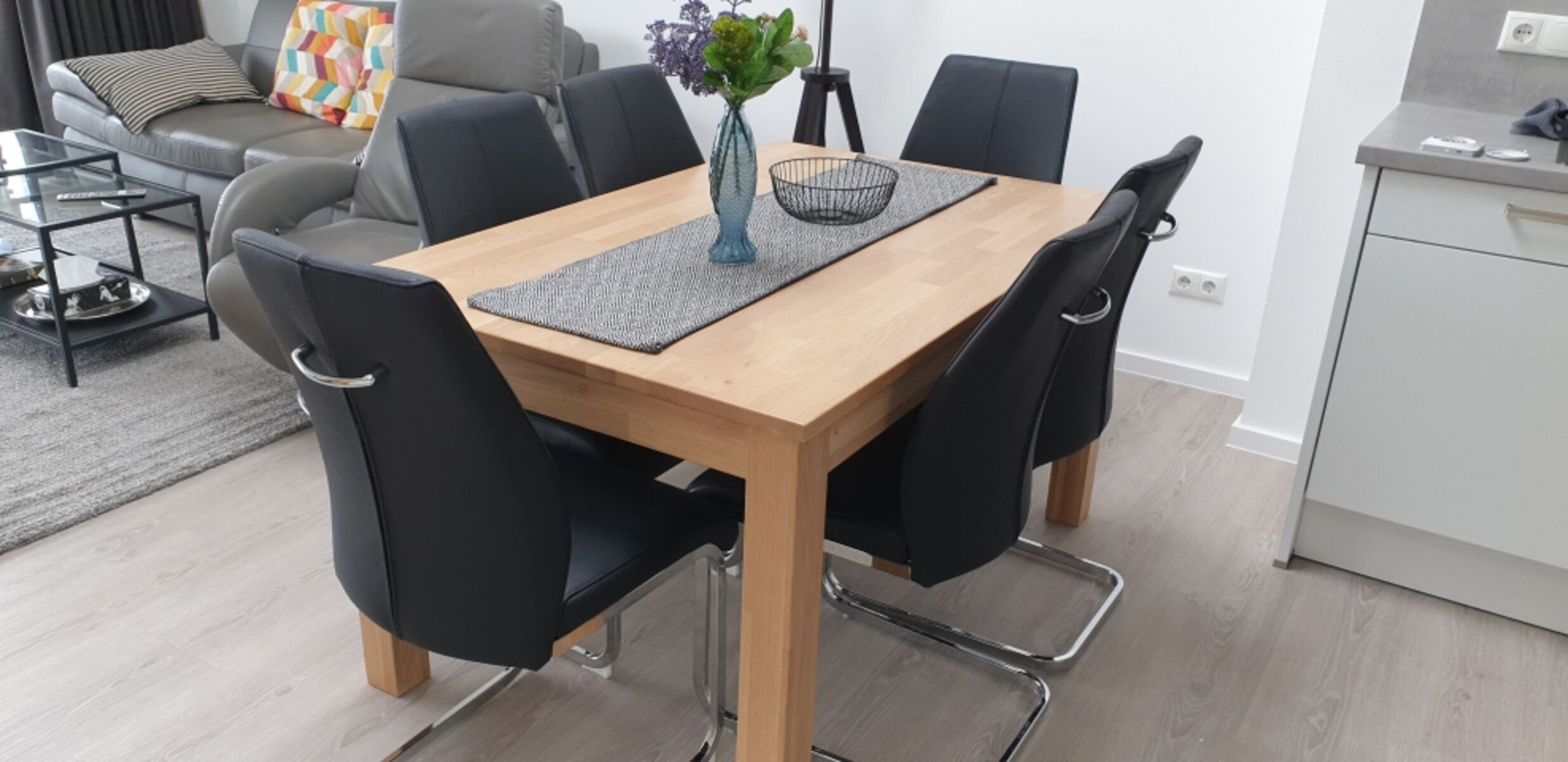 Unsere großzügige 99 m² Ferienwohnung "Ausblick" bietet modernen Komfort und ist bequem über einen Aufzug erreichbar. Sie befindet sich im 5. Obergeschoss des Haus Arkona-Komplexes in Prora auf Rügen.