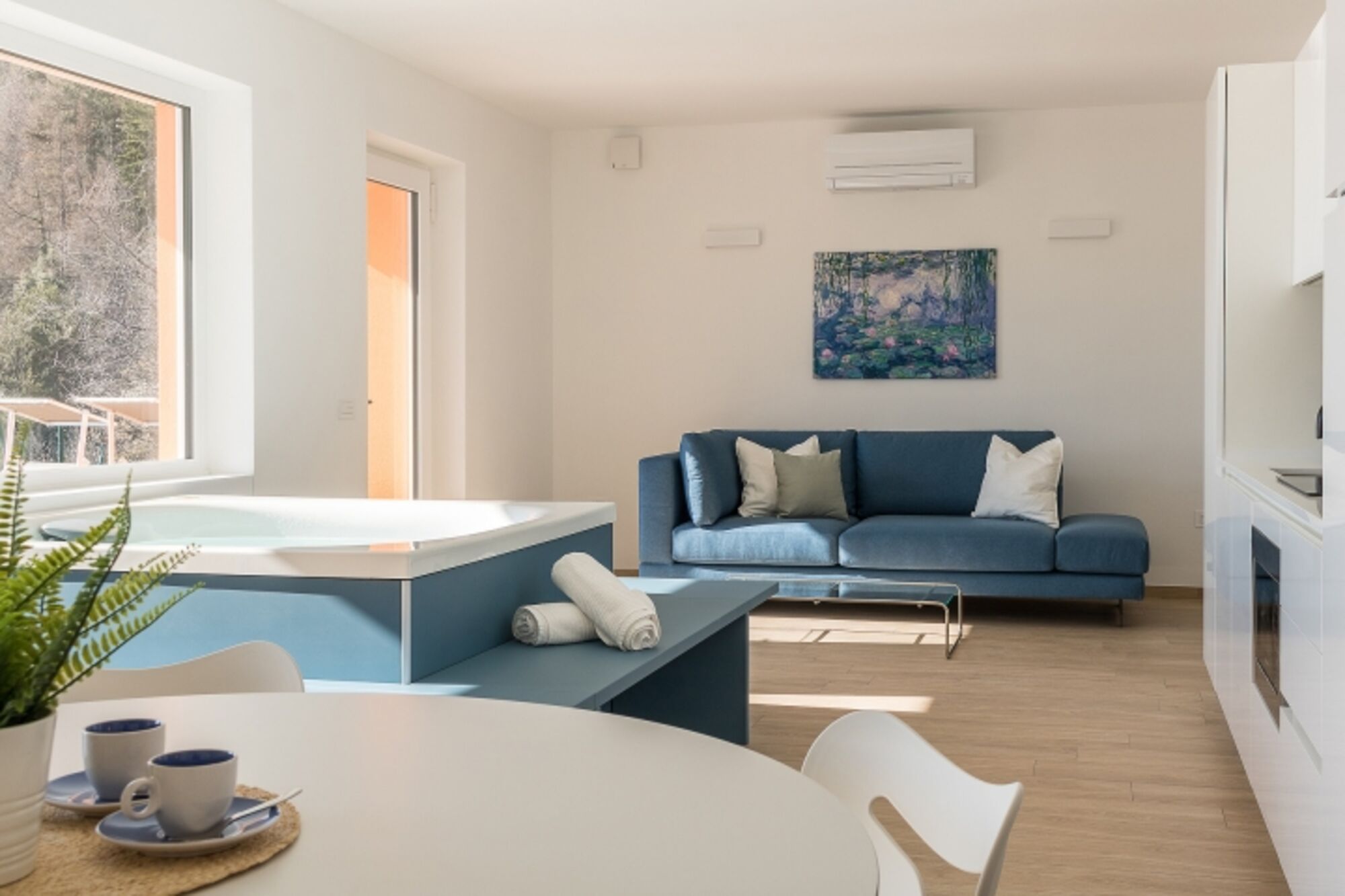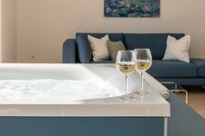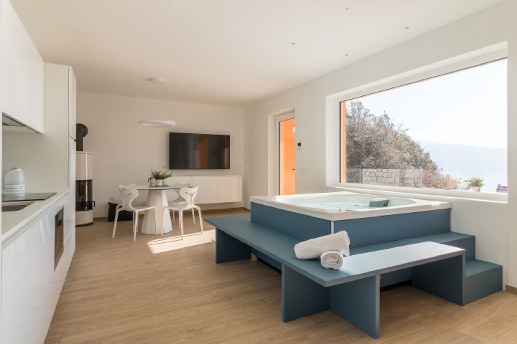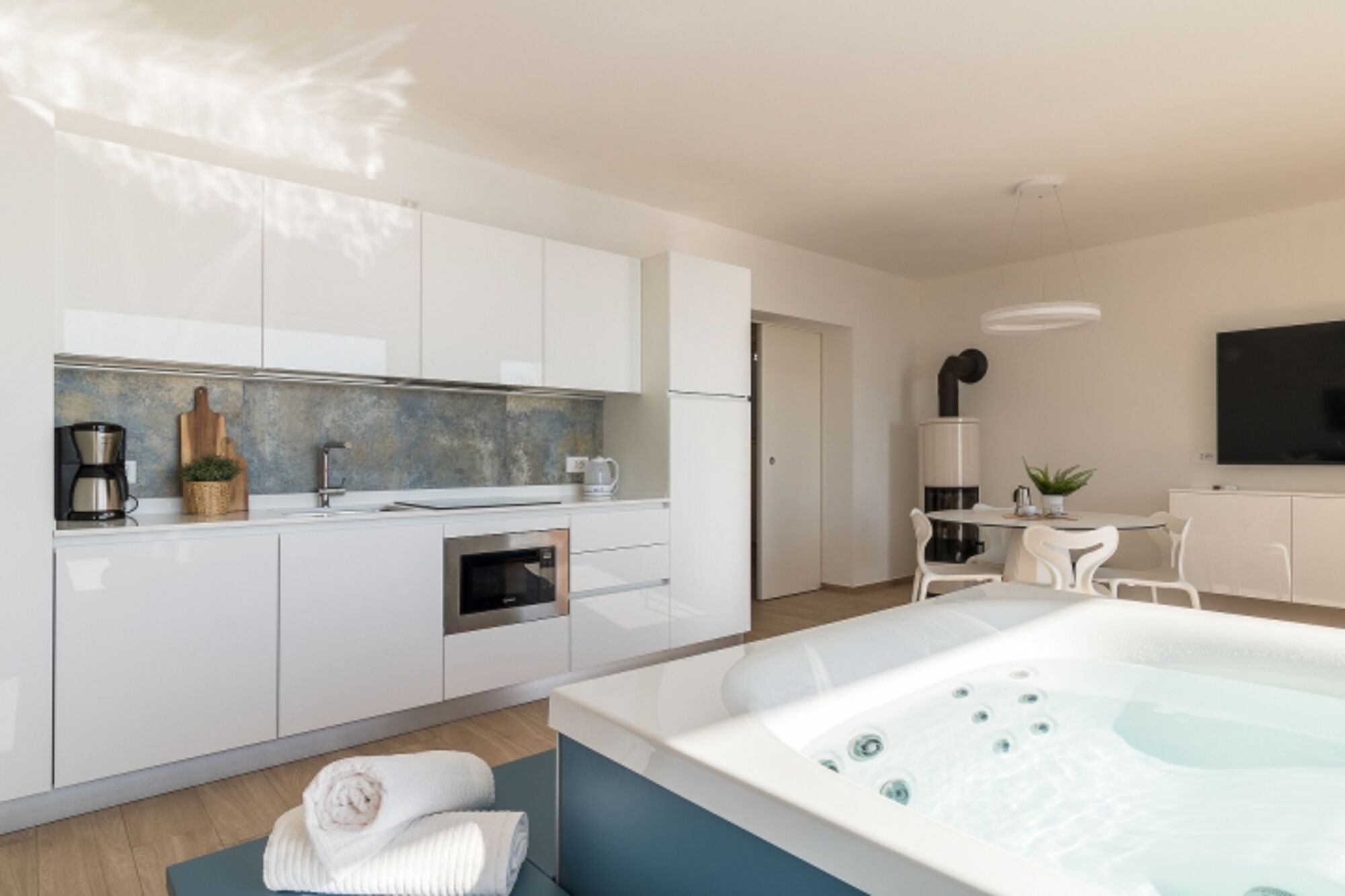 Beim Betreten der Wohnung werden Sie von einer Whirlpool Jacuzzi Wanne mit Traumblick empfangen. Im Wohnzimmer befindet sich ebenso eine Couch, ein 65iger Flachbild- TV mit internationalen Kanälen, Esstisch und Stühle, Holzofen und eine integrierte, moderne vollausgestattete Küche mit Induktionsherd, Kühl-Gefrierkombination, Mikrowelle, Wasserkocher, Spülmaschine, Kaffeemaschine und Toaster.
