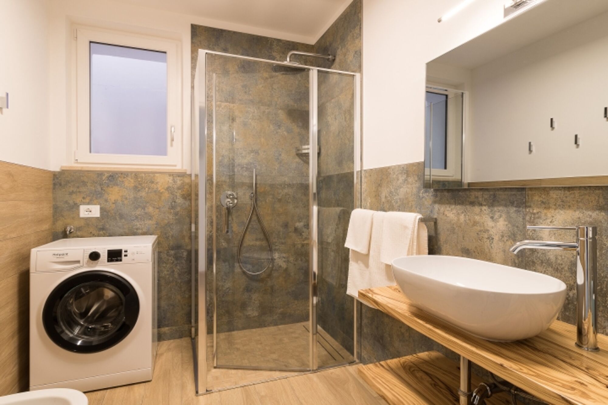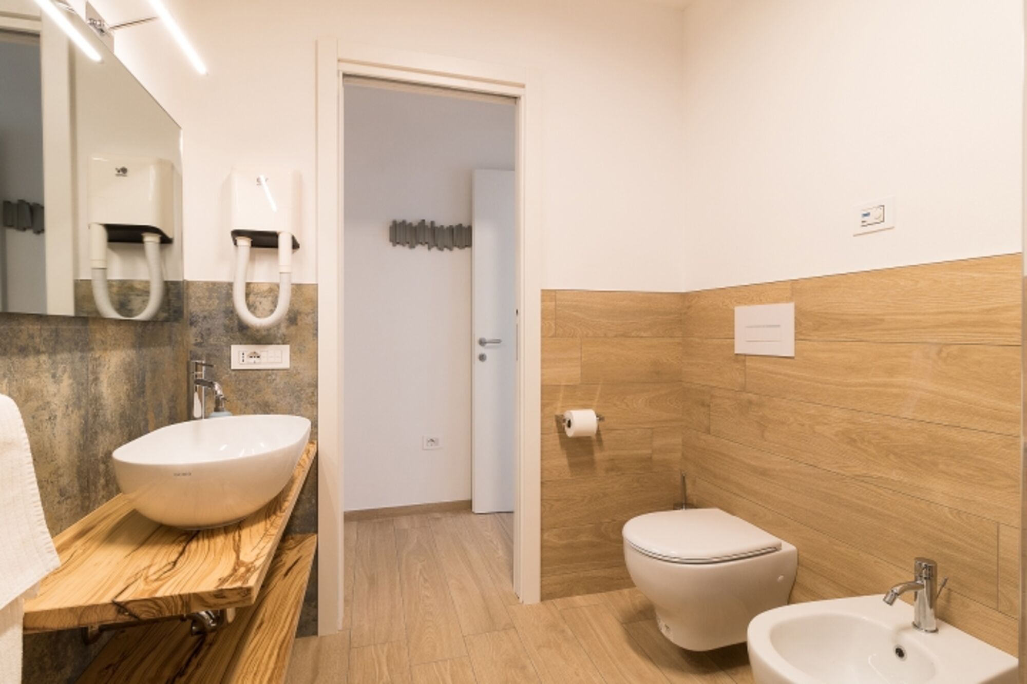 Das Bad ist mit Dusche, Waschbecken mit Naturholzablage aus Olivenbaumholz von Tignale, Bidet, WC und Föhn bestückt. Zudem gehört ein fester Parkplatz zu jeder Wohnung.