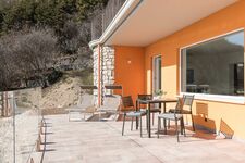 Vom Wohnzimmer hat man direkten Zutritt zur privaten Terrasse mit phantastischem Seeblick, wo man seine Mahlzeiten in einer Traumkulisse einnehmen kann.