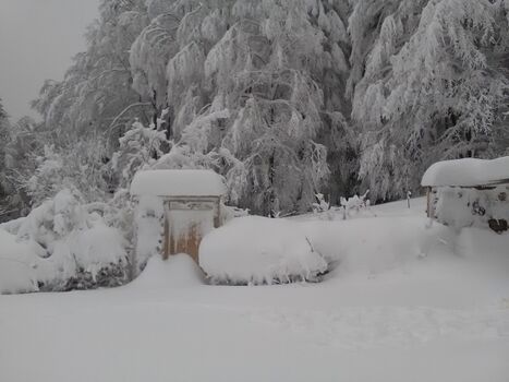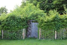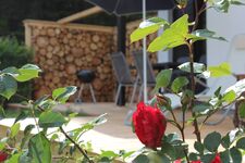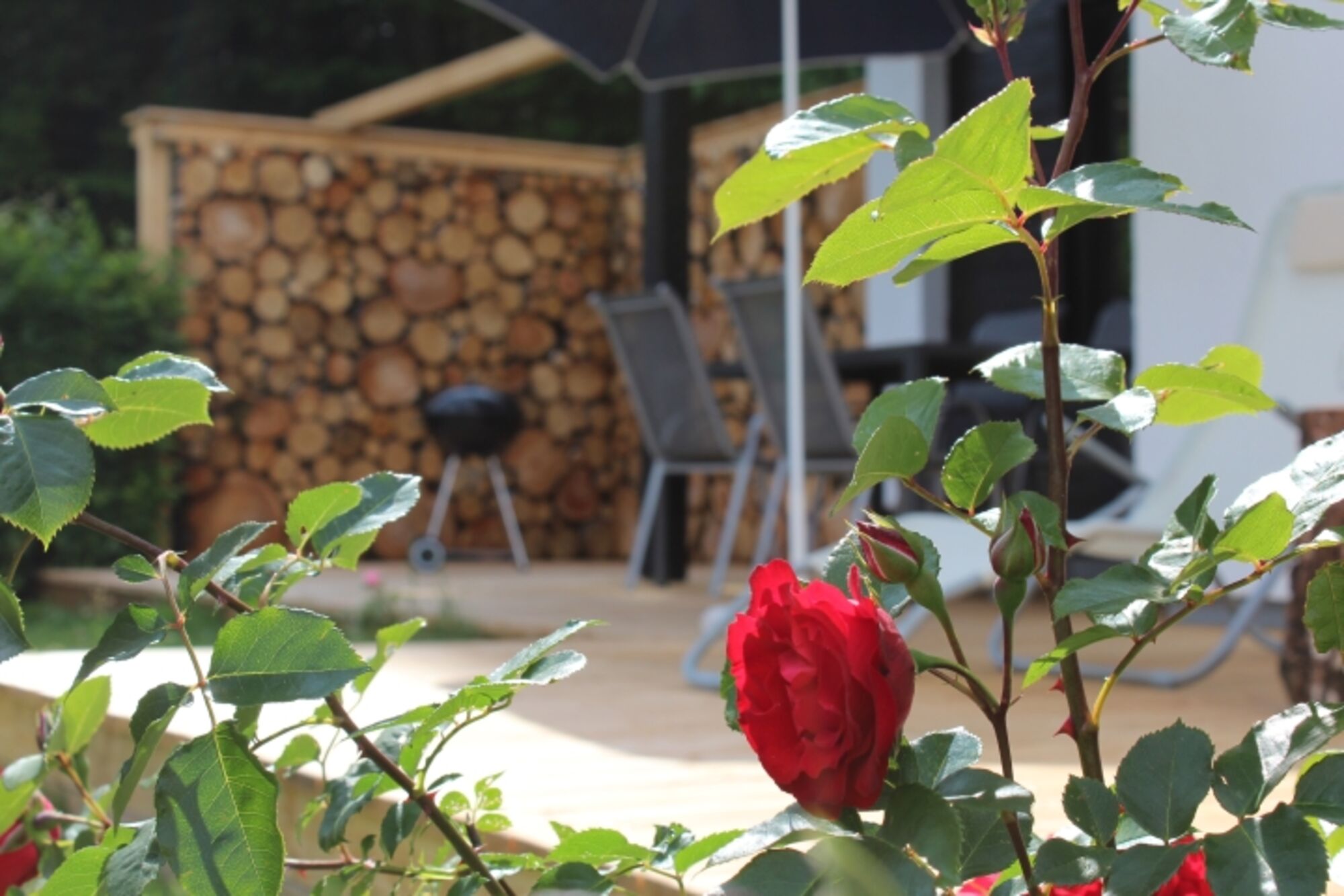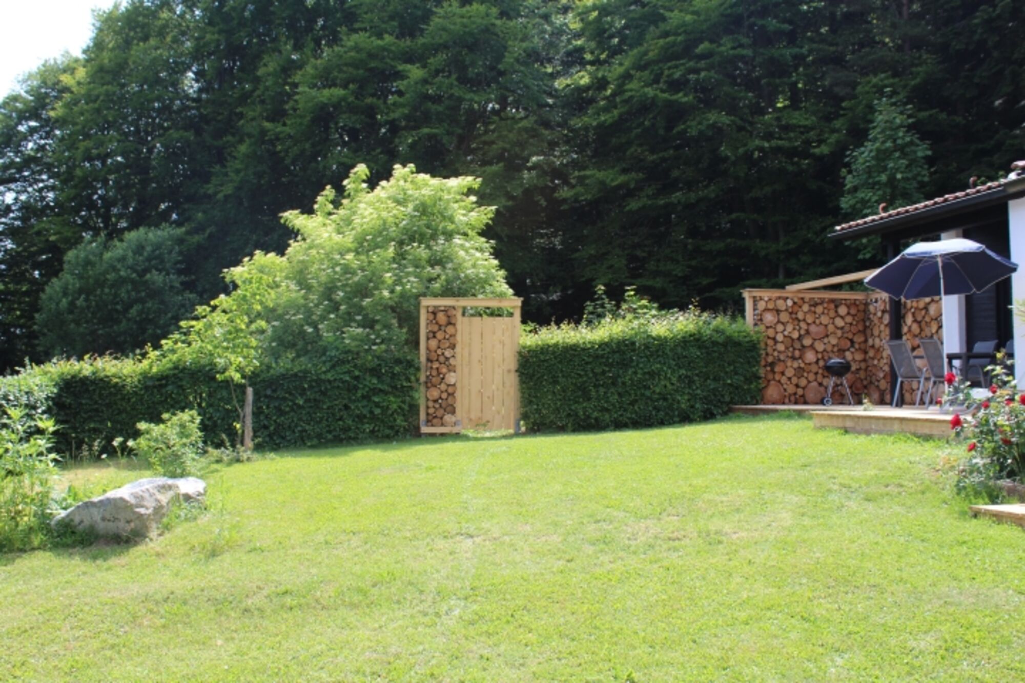 - Das Grundstück ist komplett mit einem Holzzaun und teilweise mit einer Hecke und einem Sichtschutz aus Baumstämmen umgeben. So können sich Hunde und Kinder ohne