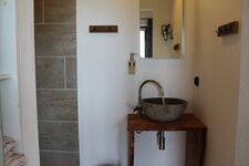 Waschbecken, Regendusche, Spiegel, Fenster im Bad